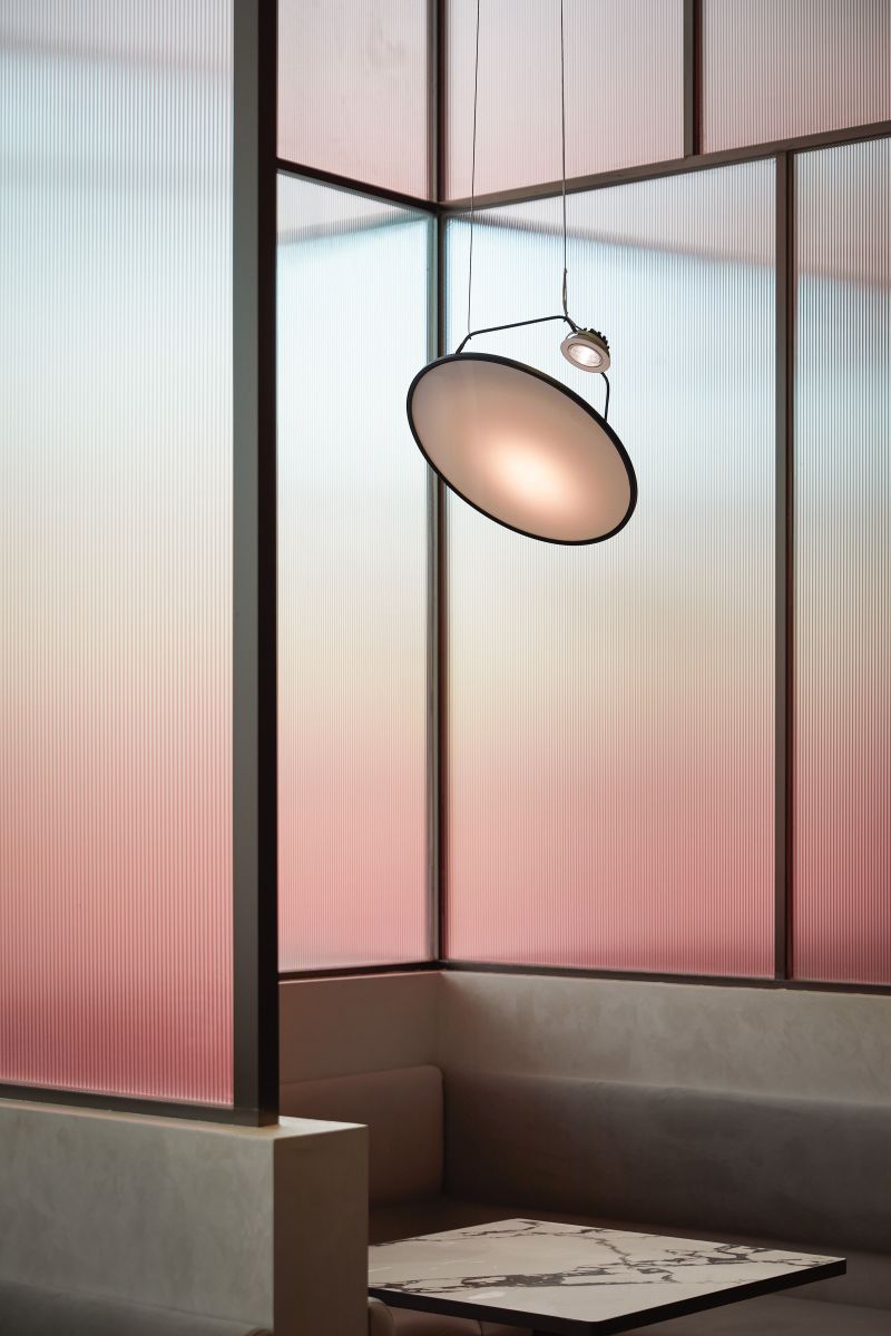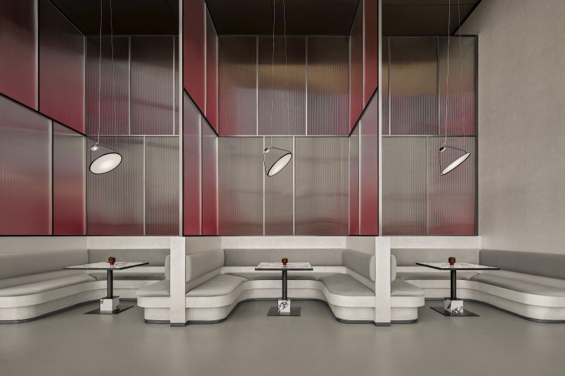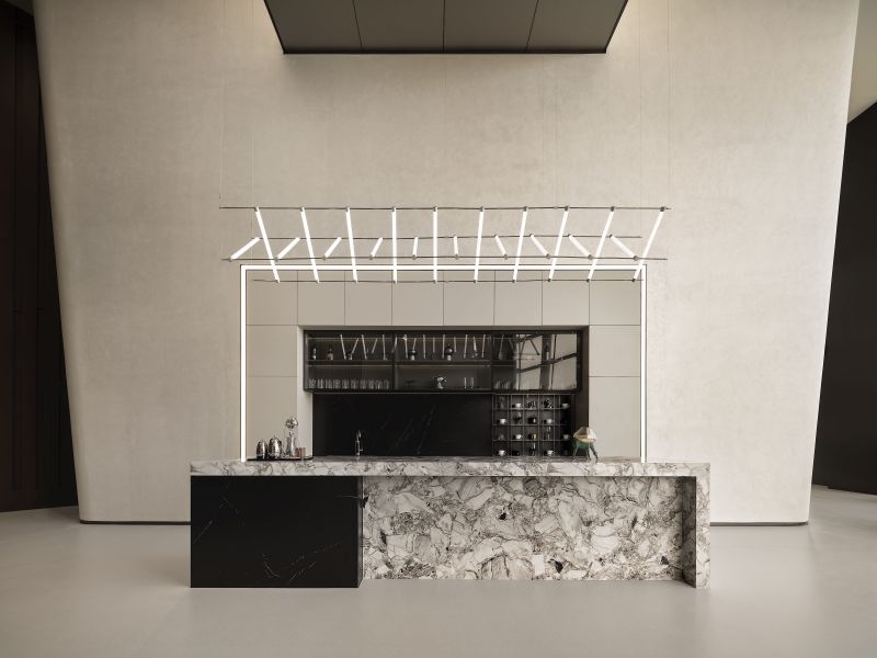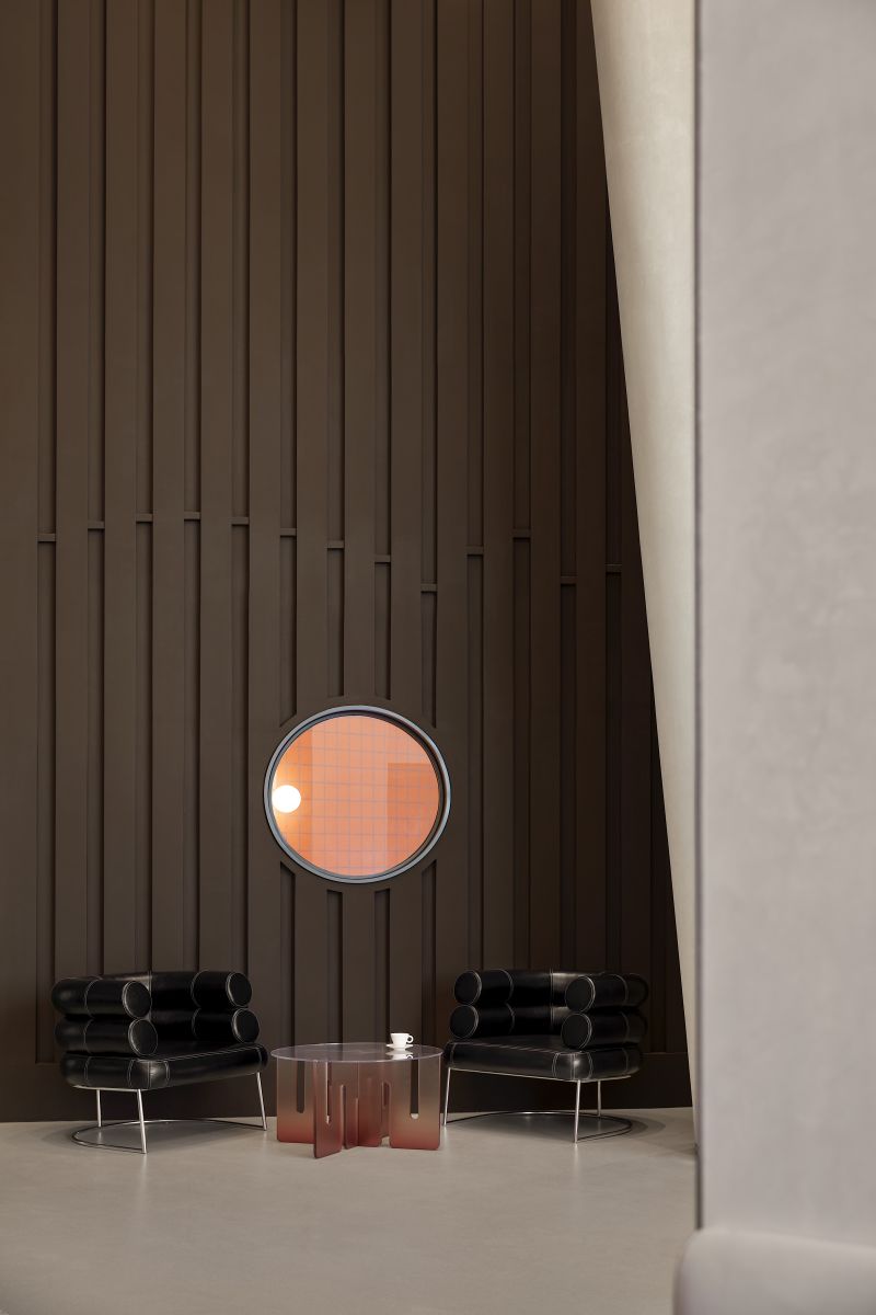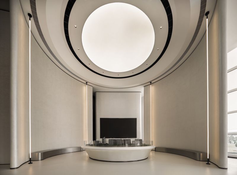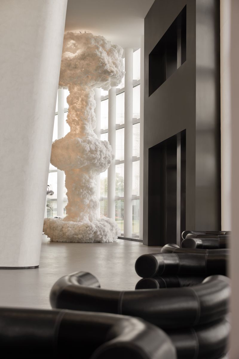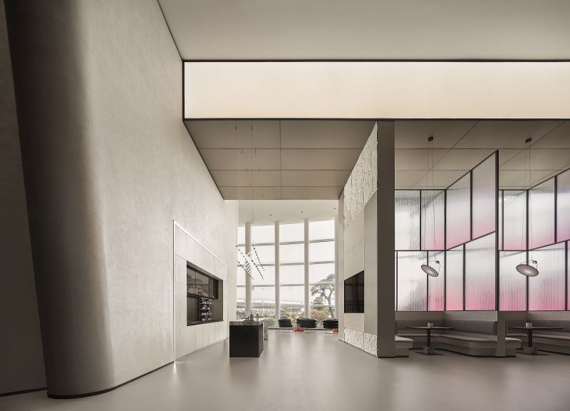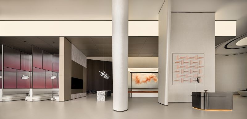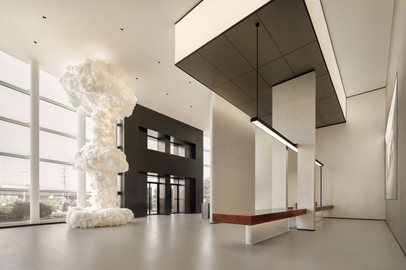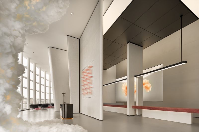 Based on the shared themes of continuity, monochrome, reduced geometric forms, and grids, the space is lined with walls, as if strolling through a mountain and sea landscape, with towering, parallel installations coming into view one after another. And the curved shape of the walls blurs the setting of corners and boundaries, creating a metaphysical space.