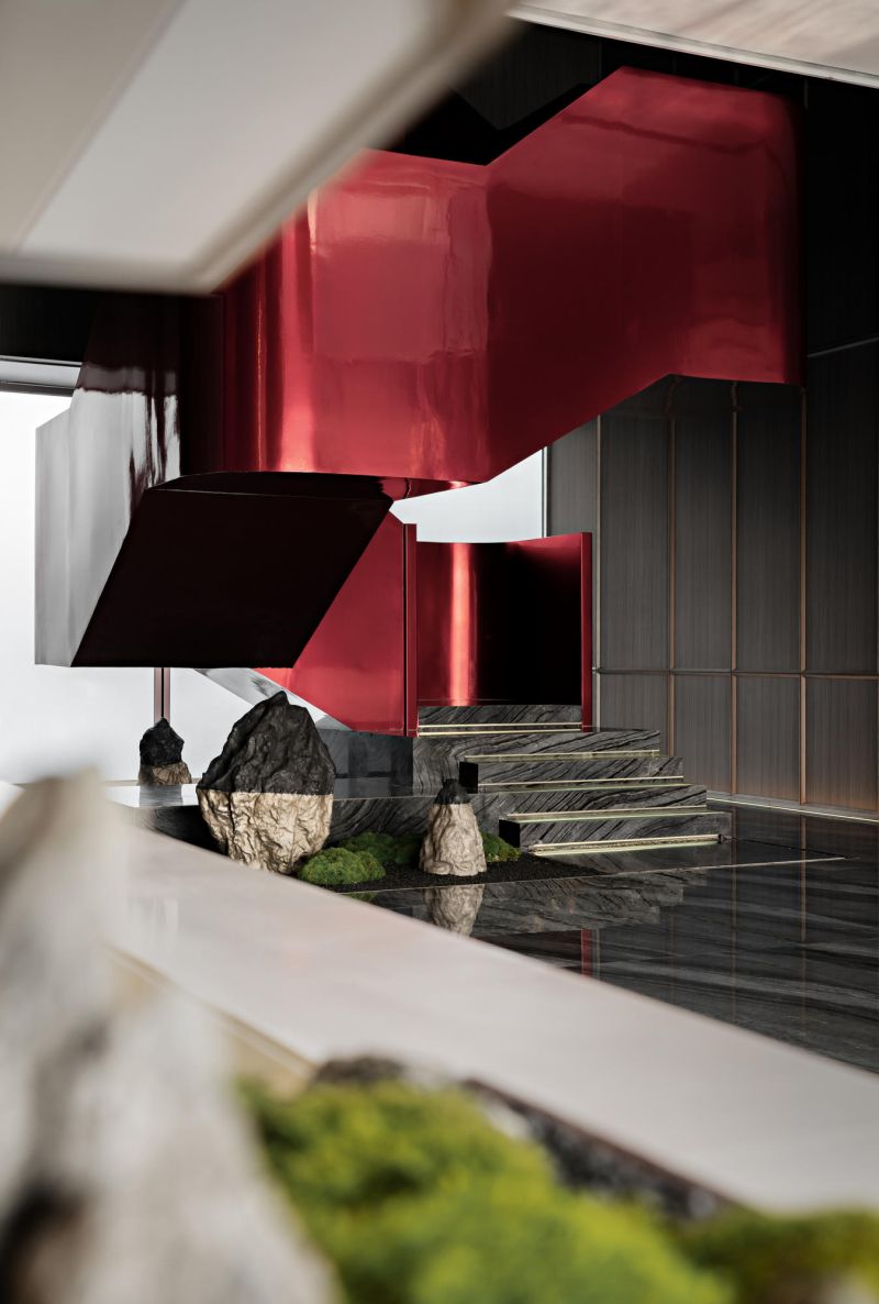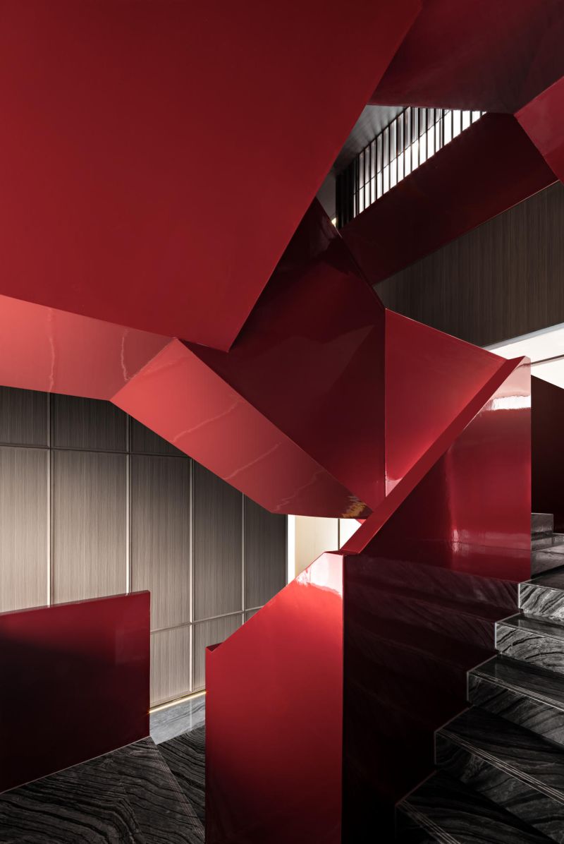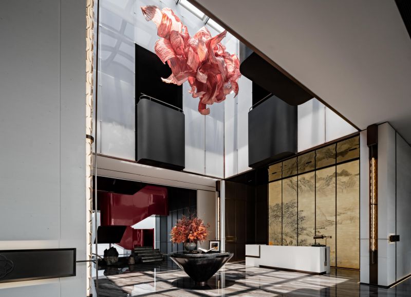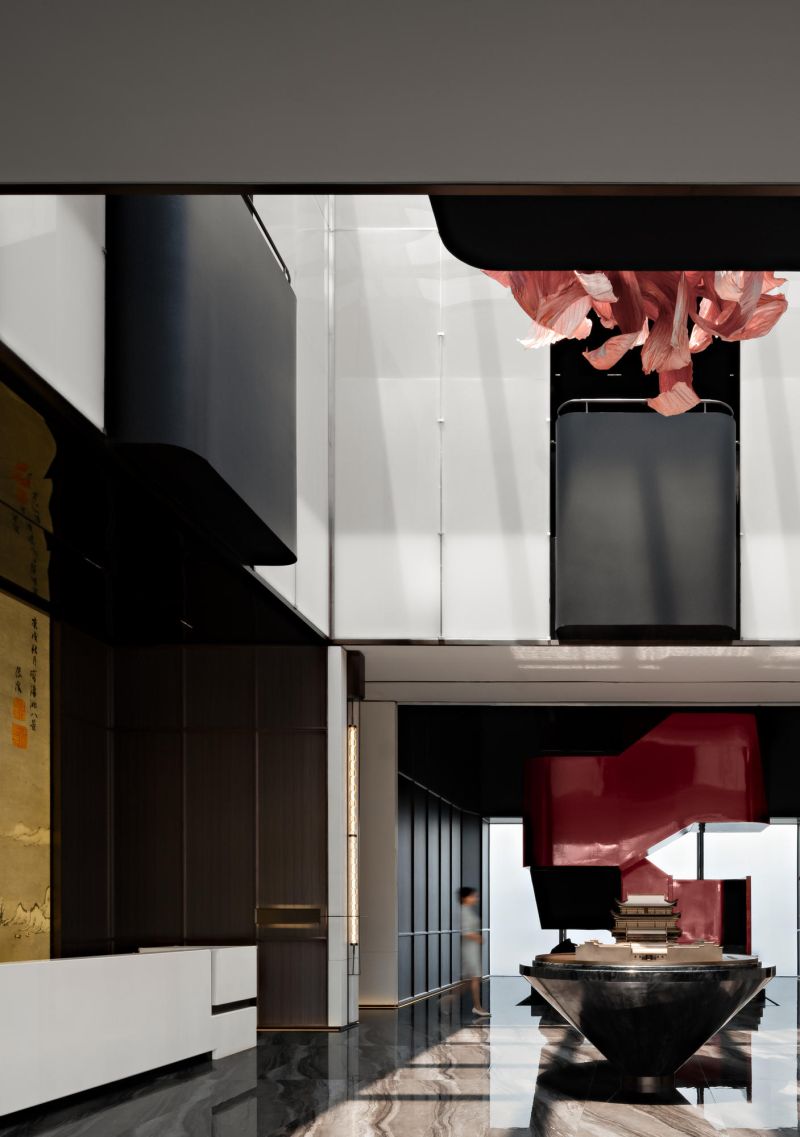 The overall space is open and flowing, and the twisting of the internal volume and the interlaced structure create a tense interior space. The lobby adopts the classic design method of central axis symmetry. The background wall of the reception hall incorporates local culture, which is the Changsha-specific Xiaoxiang Eight Views, integrated into the space in a new form. The geometric-shaped artistic staircase and the red color of Changsha azalea hanging from the ceiling serve as space embellishment to enhance the visual effect of the space.