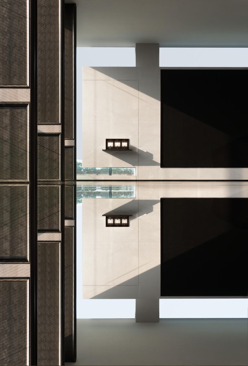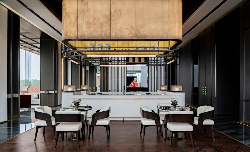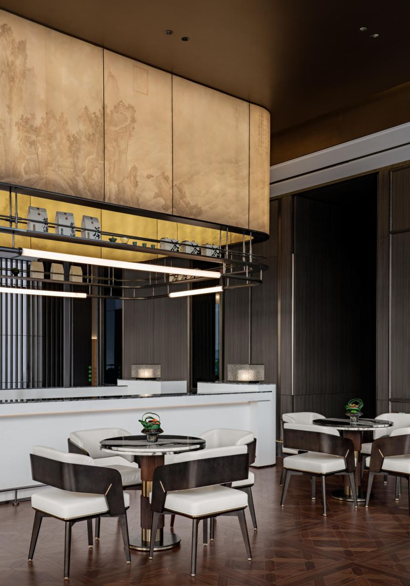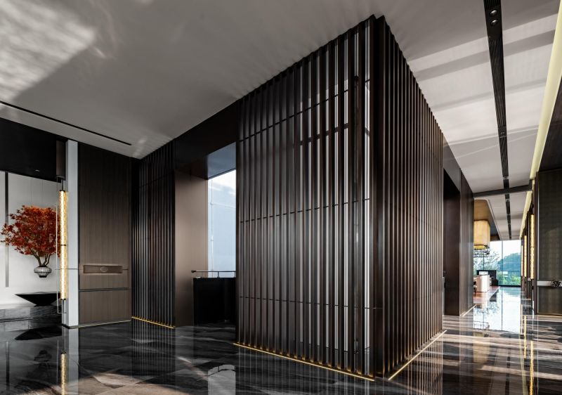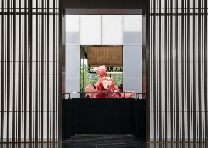 The overall space is open and flowing, and the twisting of the internal volume and the interlaced structure create a tense interior space. The lobby adopts the classic design method of central axis symmetry. The background wall of the reception hall incorporates local culture, which is the Changsha-specific Xiaoxiang Eight Views, integrated into the space in a new form. The geometric-shaped artistic staircase and the red color of Changsha azalea hanging from the ceiling serve as space embellishment to enhance the visual effect of the space.