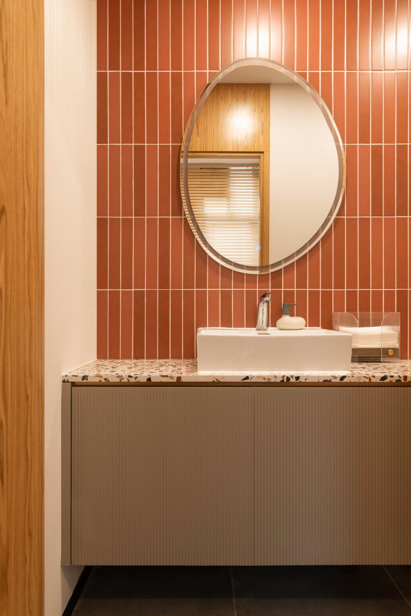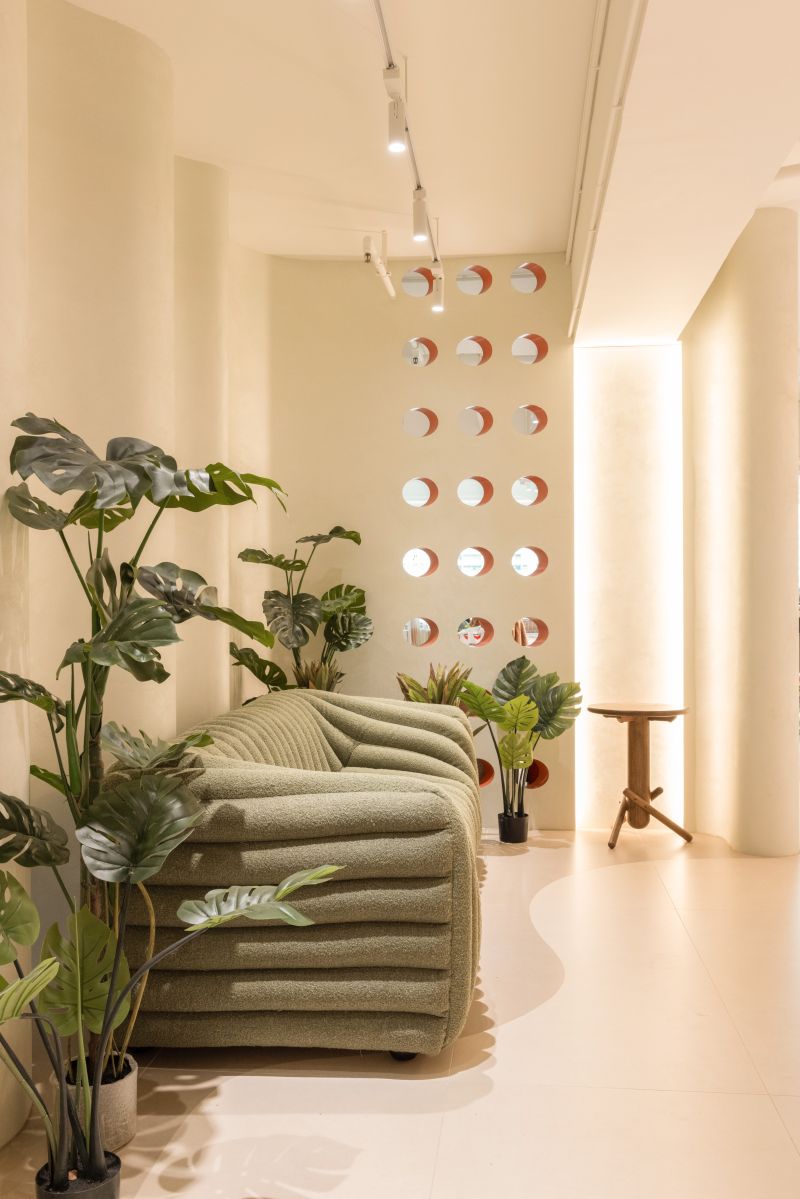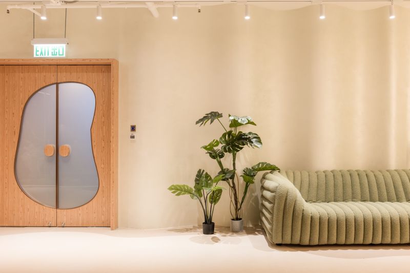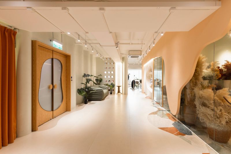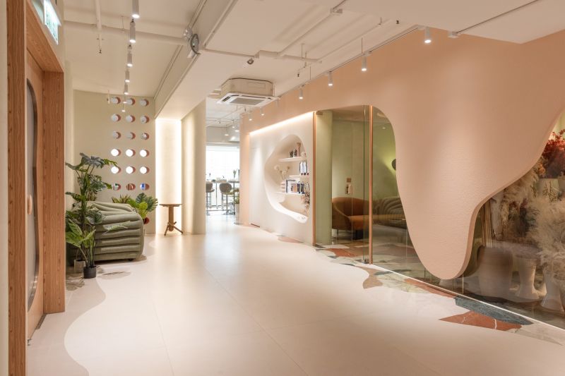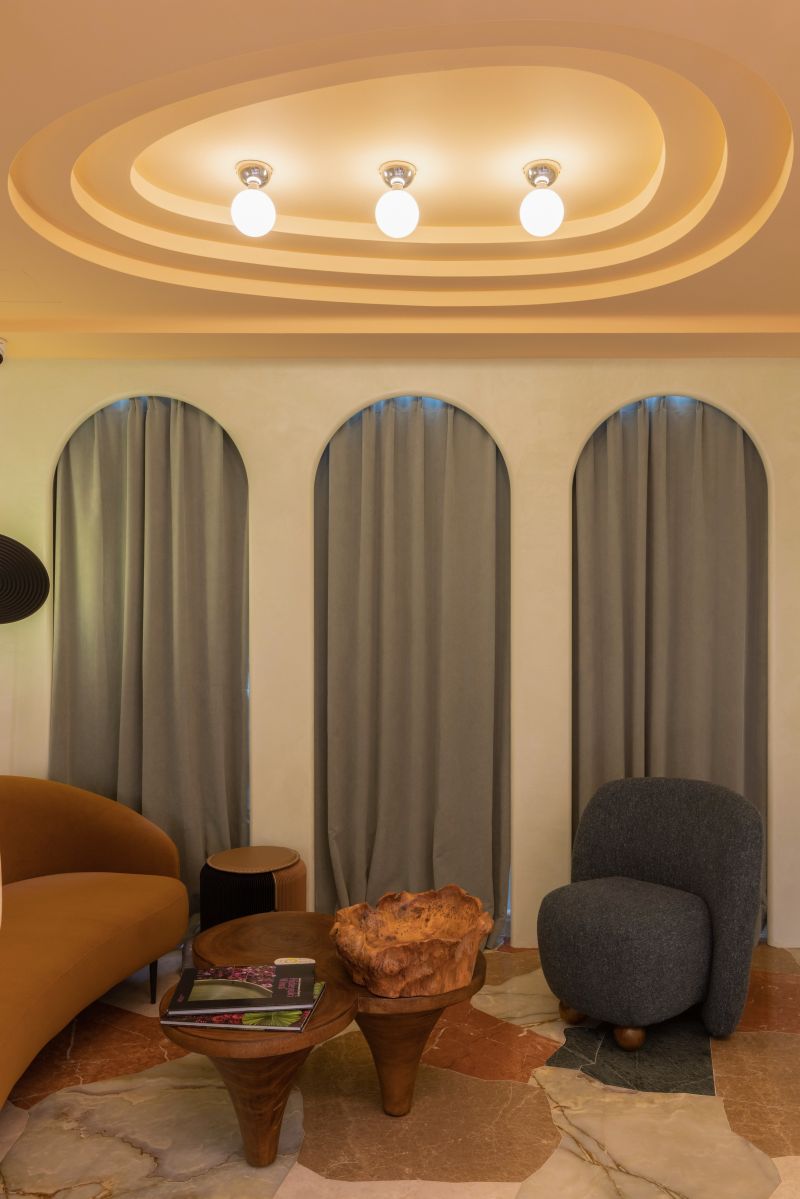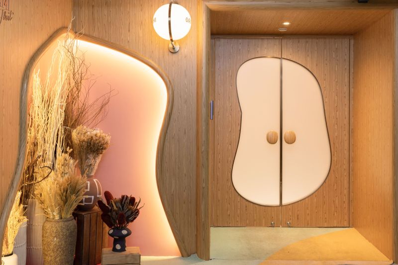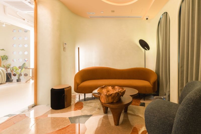 We use puzzle marble floor and natural curves as key design elements, accented by bold wood veneer. Striking lighting fixtures and furniture complement the client's plants, enhancing the overall character of the space.