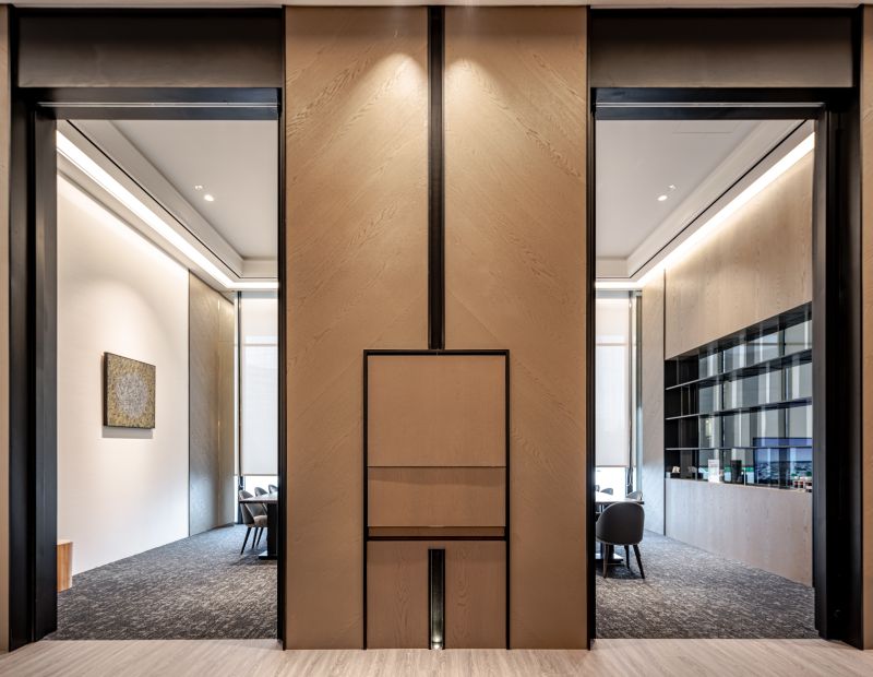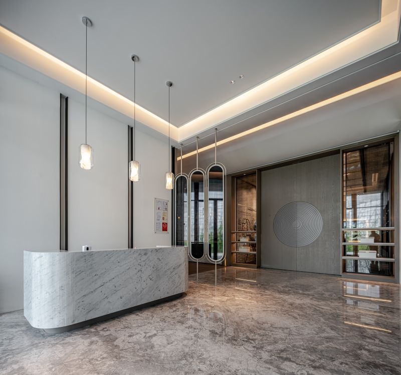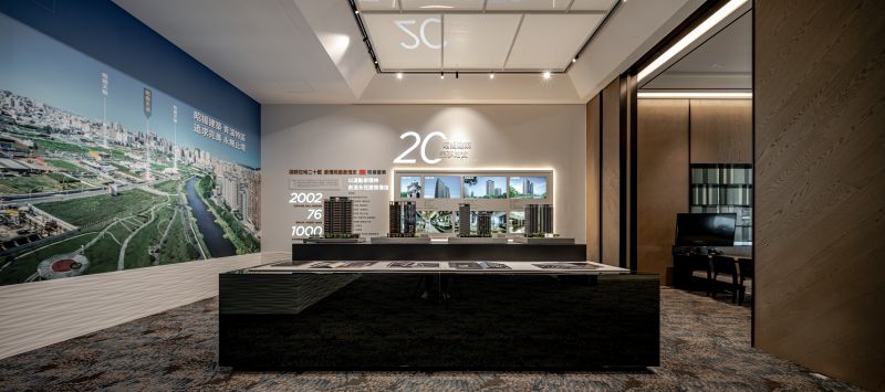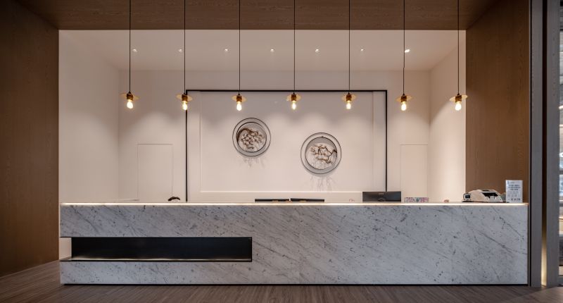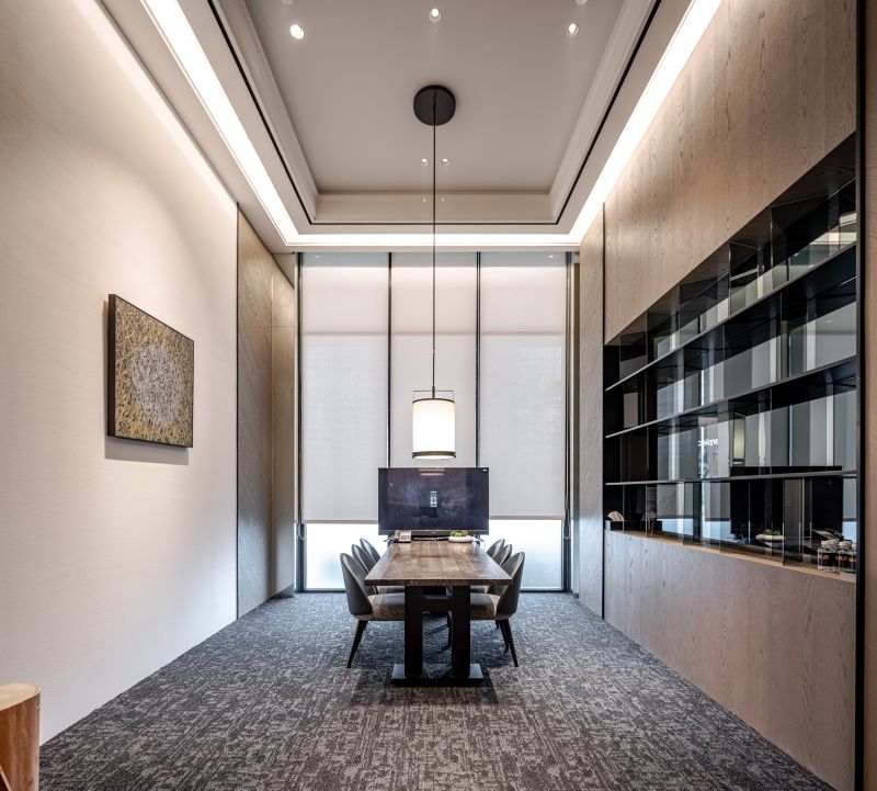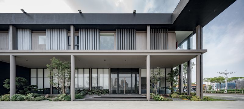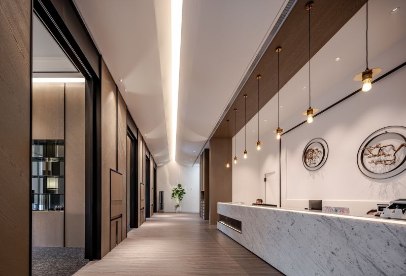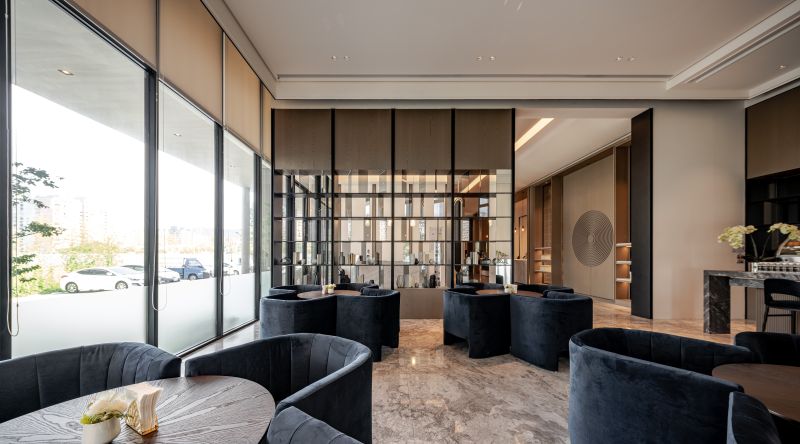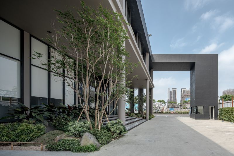 The sales office has an architectural appearance of black and white tones and rational lines, and the outdoor courtyard is embellished with green, creating a calm texture and symbolizing the image of the masses it attracts. Mild materials such as wood grain and fabric are added to the interior to receive guests for negotiation in a comfortable space. Stone, metal and lighting are also merged to make the details more delicate, and the low-luxury field gives guests honorable treatment.