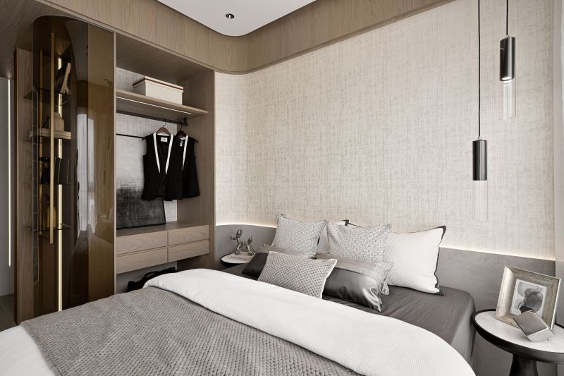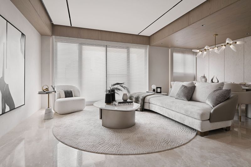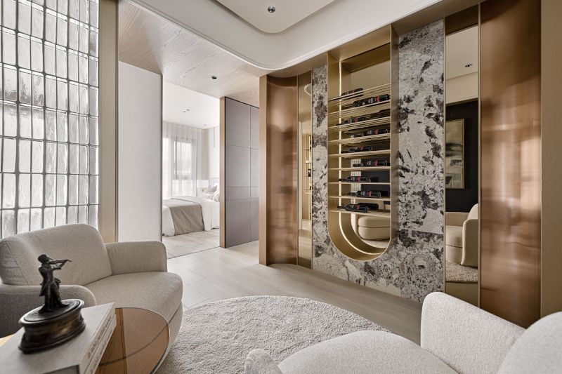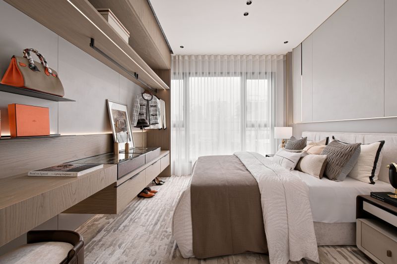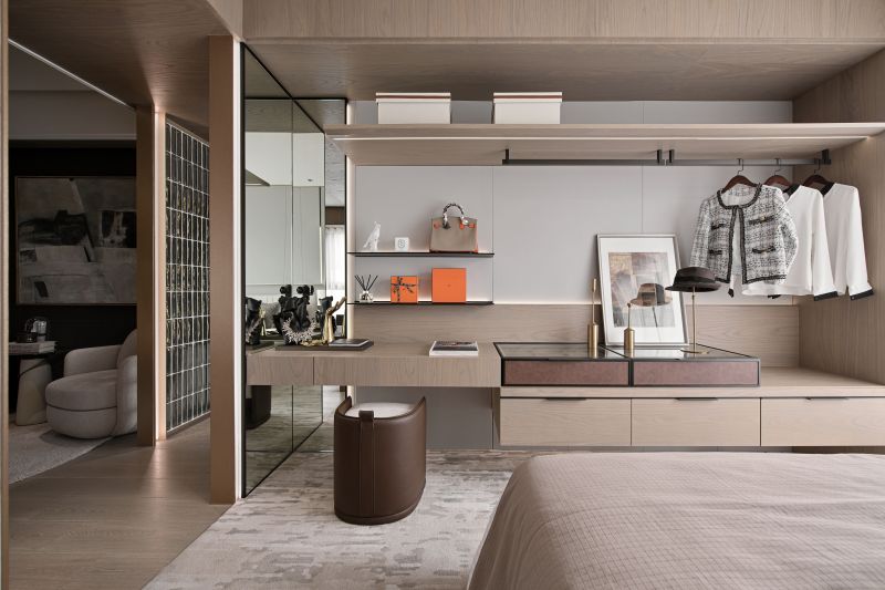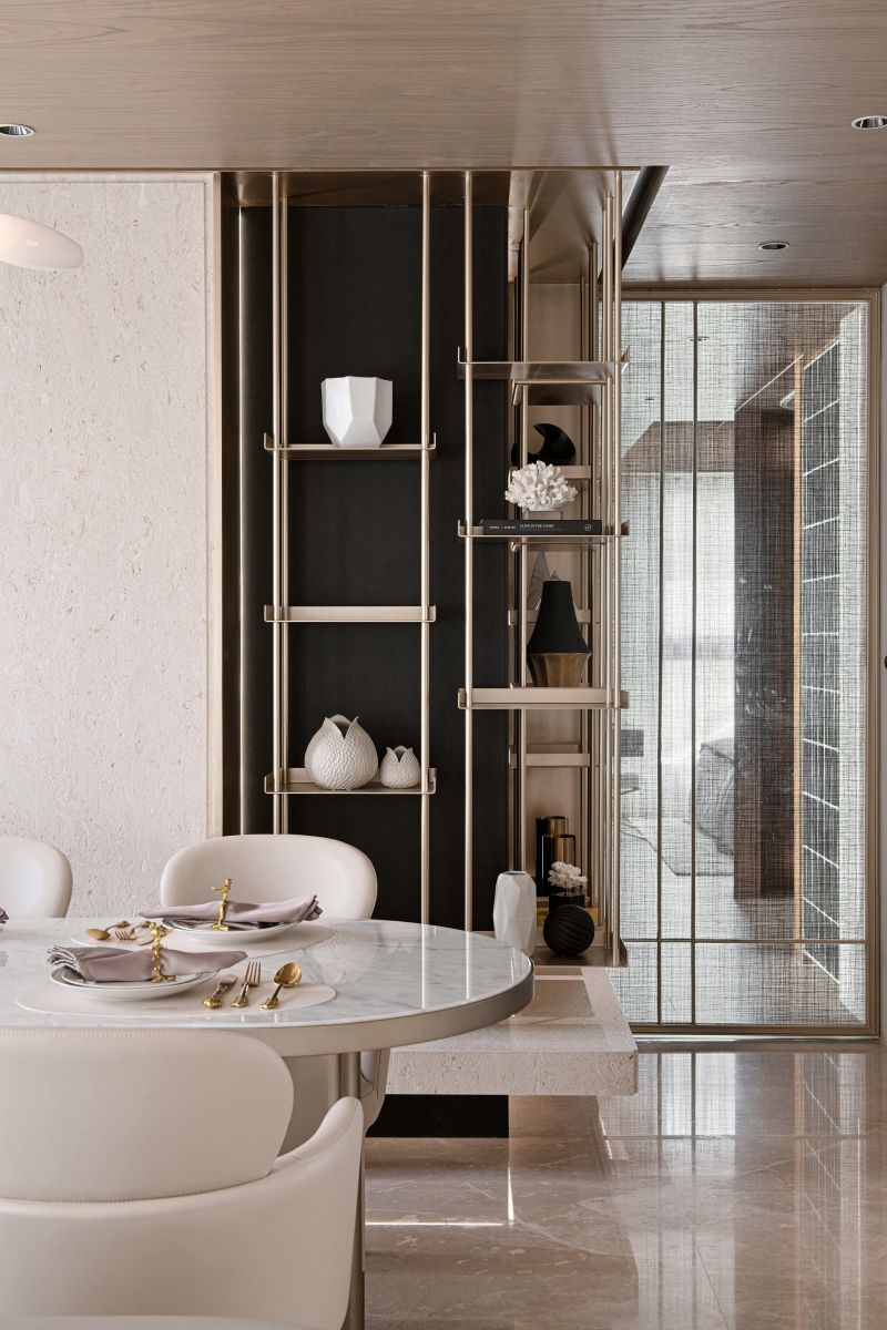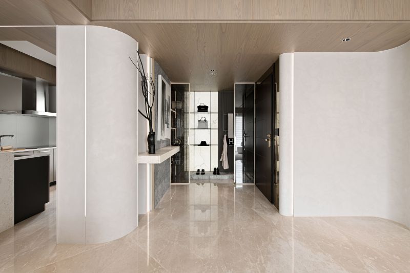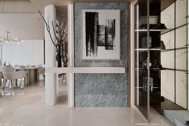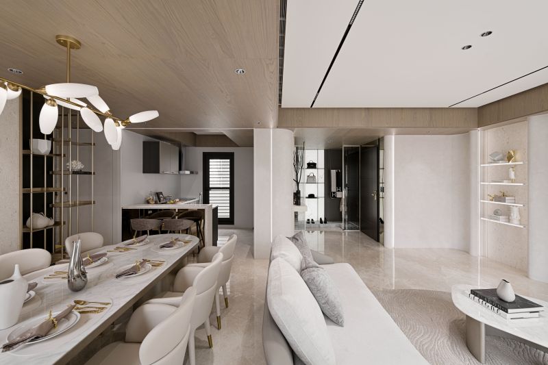 This house serves as a showroom to show the softness and sense of belonging of the building's residents. The designer then adopts elegant pale colors to cater to the bright light, through the curve shape of the main visual wall, the simplicity of environmental paint, to present a pure image of life. The whole field is divided into two blocks, which are the external space for entertaining guests, working and meetings, and the internal space for intimate interaction between small families. By space configuration and color, the designer shapes the proverb called "light hall and dark room".