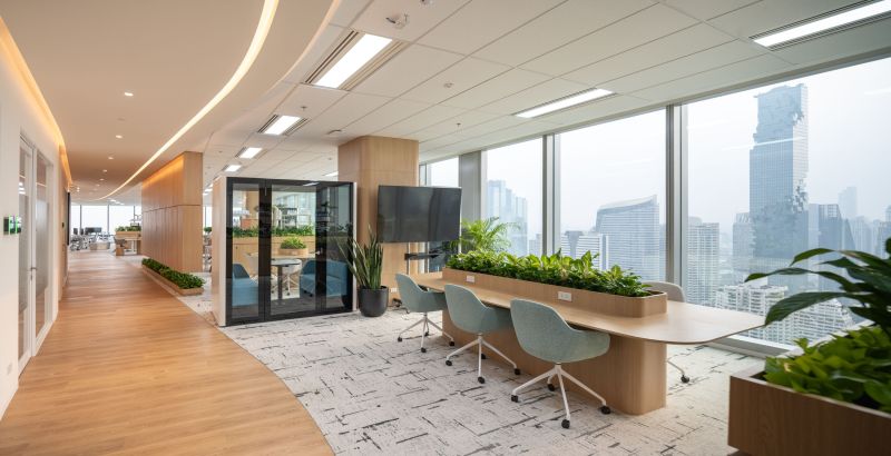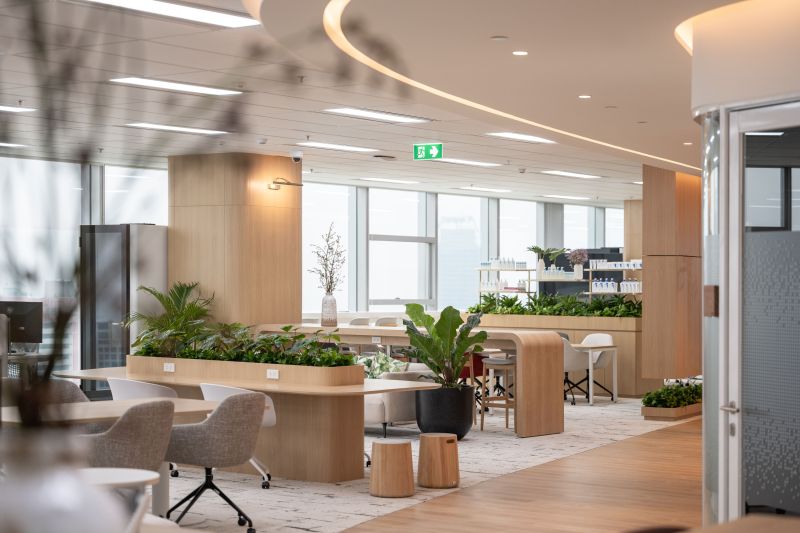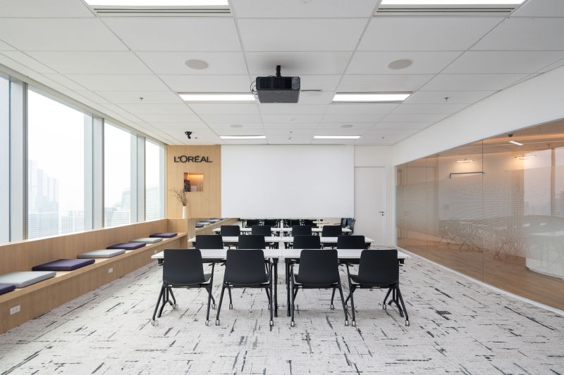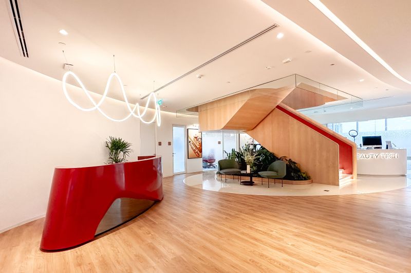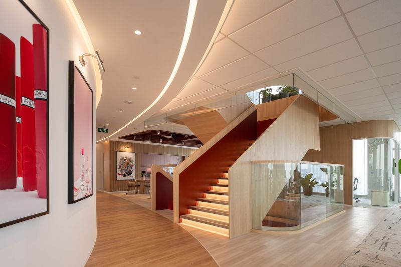 The L'Oréal Office in Bangkok spans four floors, embodying beauty and functionality. It integrates L'Oréal's strong brand identity with an innovative, sustainable workspace. Inspired by "beauty for all," the design emphasises diversity through organic shapes and flowing corridors. Key features include a curvilinear corridor and a three-story staircase promoting collaboration. Materials like timber laminate and cosmetic colours create a warm atmosphere. Achieving LEED Gold certification, the office balances aesthetic beauty with practicality, enhancing both employee and visitor experiences.