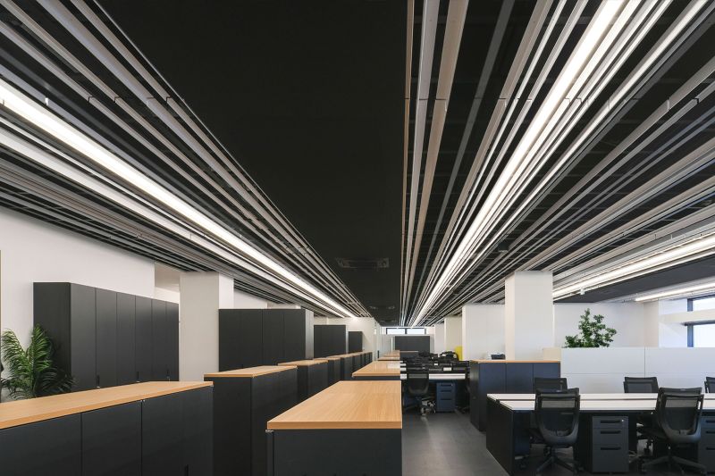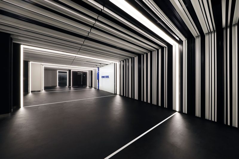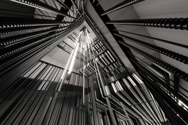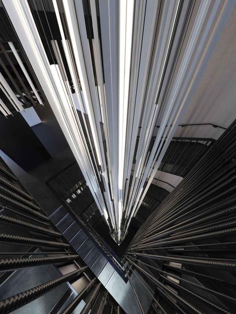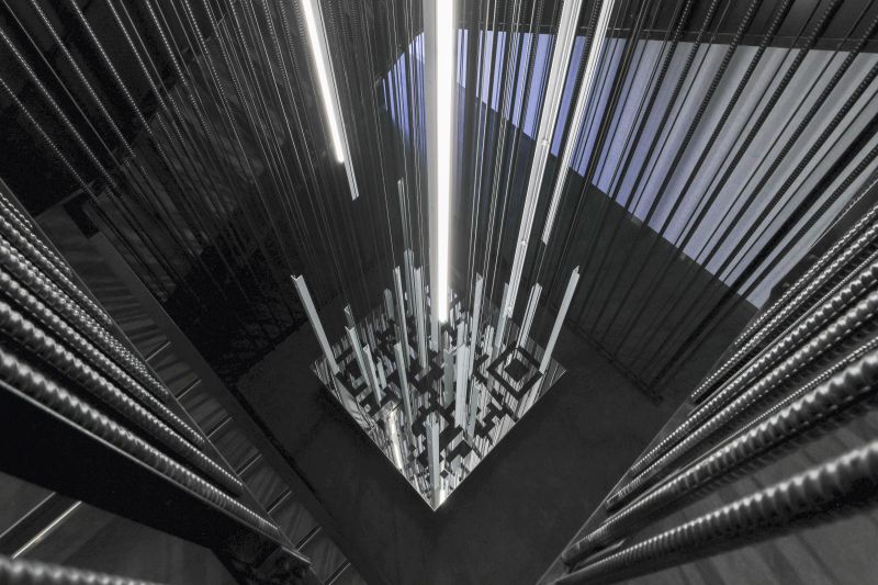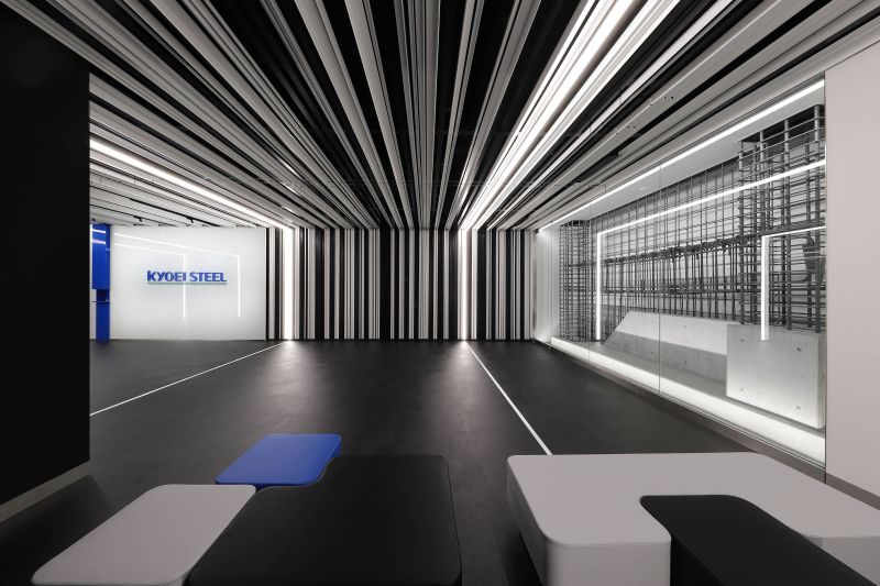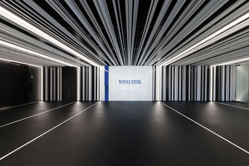 Kyoei Steel recycles steel scrap using electric furnaces, ensuring a sustainable production cycle. The new Yamaguchi office, themed An Office Embraced in Recycled Steel, embodies this transformation. The exterior draws from stacked billets, while the interior uses locally sourced angle steel and rebars. Barcode and QR code designs extend throughout office spaces, harmonizing steel and ambient light. The lighting design transforms these intricate patterns into three-dimensional forms, adding depth and movement, symbolizing Kyoei Steel’s identity and long-term vision.