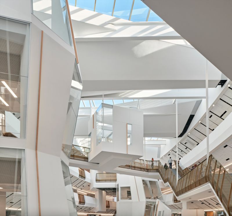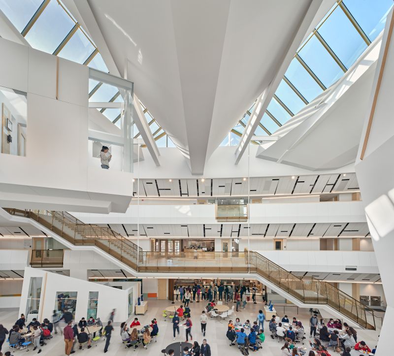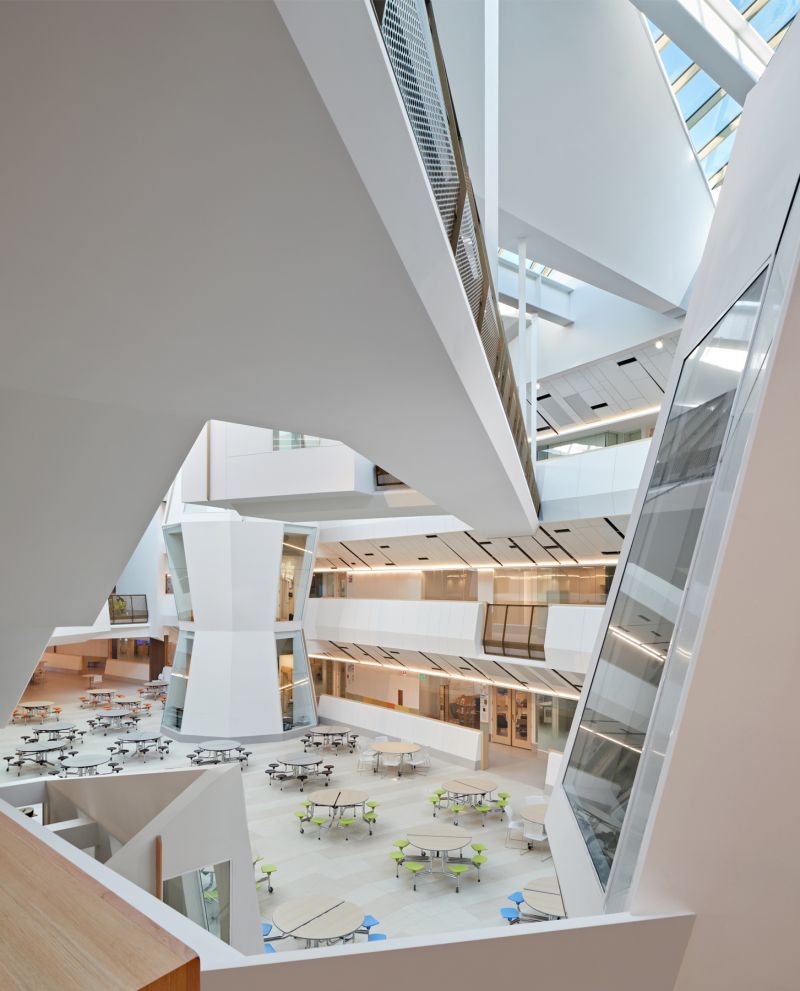 Fuller Middle School provides students the flexible, expansive space to build upon the preparatory STEAM education pedagogies Framingham students experience in elementary school. A three-story Learning Commons, paired classroom suites with shared teacher planning offices to promote team teaching, and flexible indoor and outdoor gathering areas bring together the entire academic community, showcasing project-based learning and inspiring creativity and collaboration.