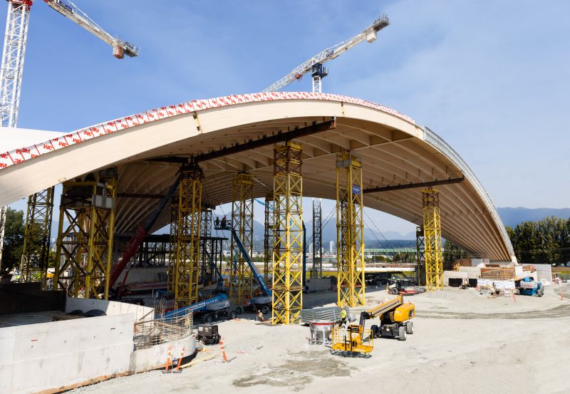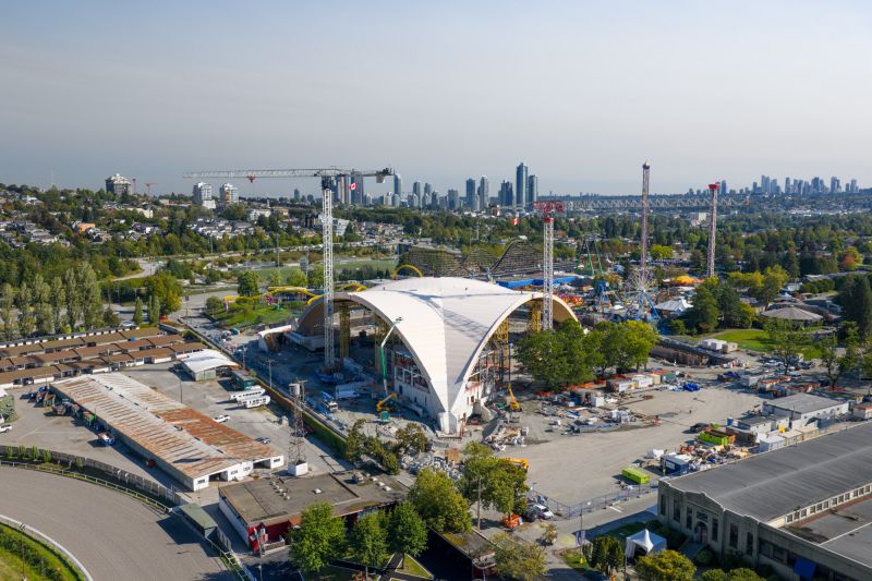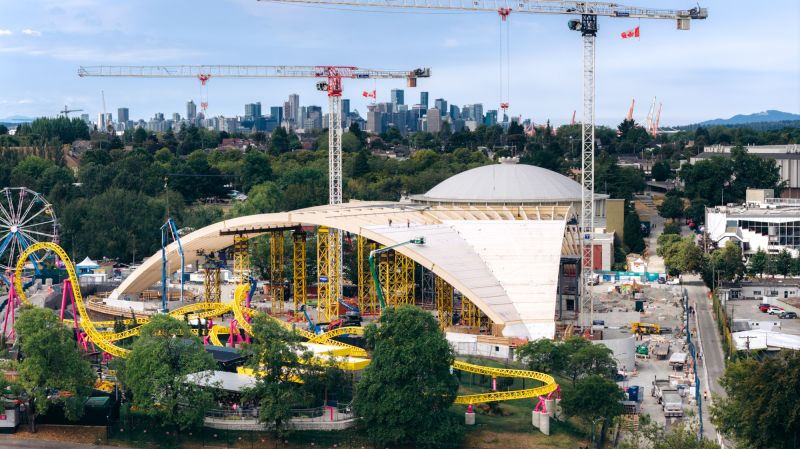 The Freedom Mobile Arch at Vancouver’s Pacific National Exhibition will soon become one of the world’s largest free-span timber arch structures. Transforming a former 1960s open-air amphitheater, its 340-foot starburst structure of sixty glulam arches frame sweeping views of the city's picturesque North Shore Mountains. The all-electric, near-zero-emissions venue unites advanced performance systems, universal accessibility, and sustainable design in celebration of local identity, resilience, and connection through innovative mass timber architecture.