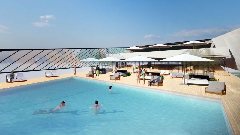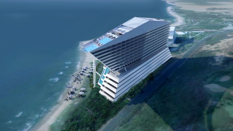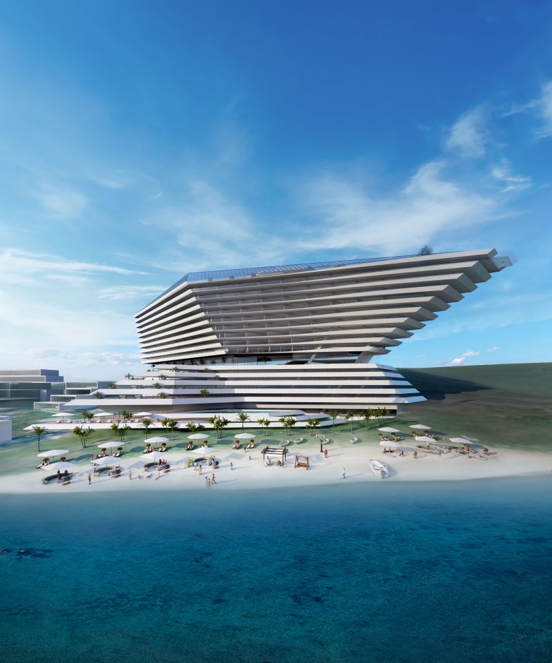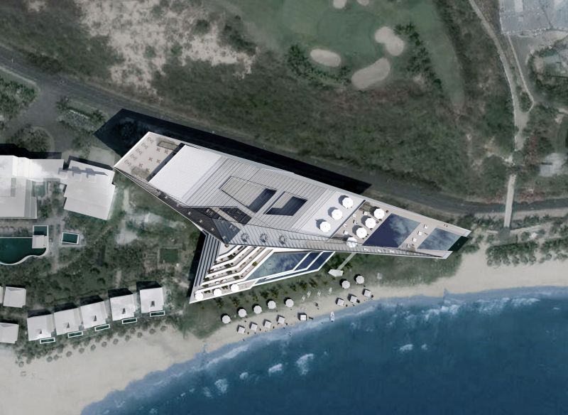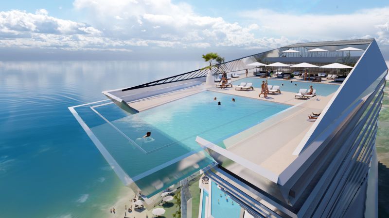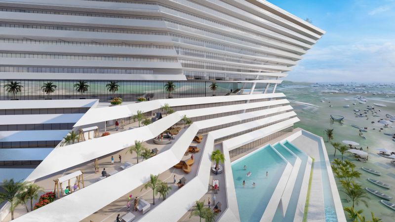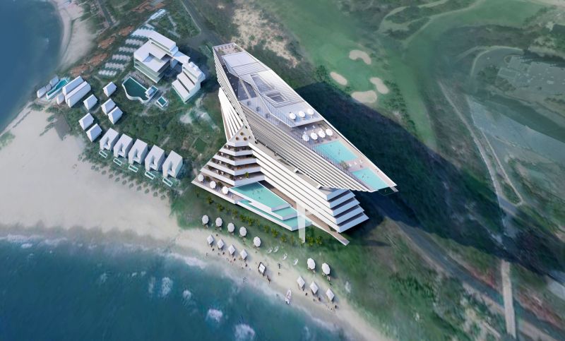 Hotel Marina Gold, opening, is a large resort hotel located on Mui Ne Beach in southeastern Vietnam, about 170 kilometers from Ho Chi Minh City. The hotel features 500 rooms, including 50 suites, with half offering ocean views and the other half mountain views. Amenities include infinity pools, restaurants, and a unique glass-bottomed pool on the highest rooftop that extends towards the ocean, surrounded by a bar lounge and a viewing restaurant. The design theme of the hotel is "Floating Luxury Cruise Ship," showcasing a futuristic, spaceship-like architecture that captures the essence