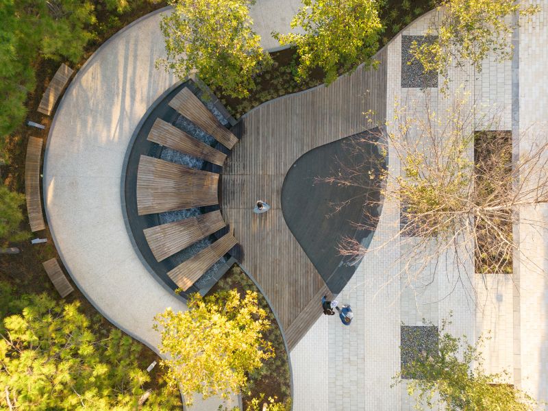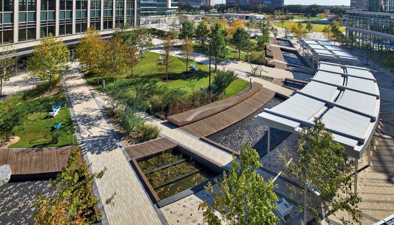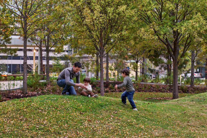 TMC Helix Park transforms 14.5 acres of downtown Houston into a revolutionary model of climate-resilient parks, marking the first phase of a 42-acre masterplan along Brays Bayou. This park reimagines urban infrastructure as a multi-functional landscape that integrates stormwater management and ecological restoration. The park addresses Houston's pressing climate challenges by creating a green sponge in the ground plane, elevating the site by five feet above the 500-year floodplain. 650 newly planted trees provide shade with cooling water features that address urban heat island effect.