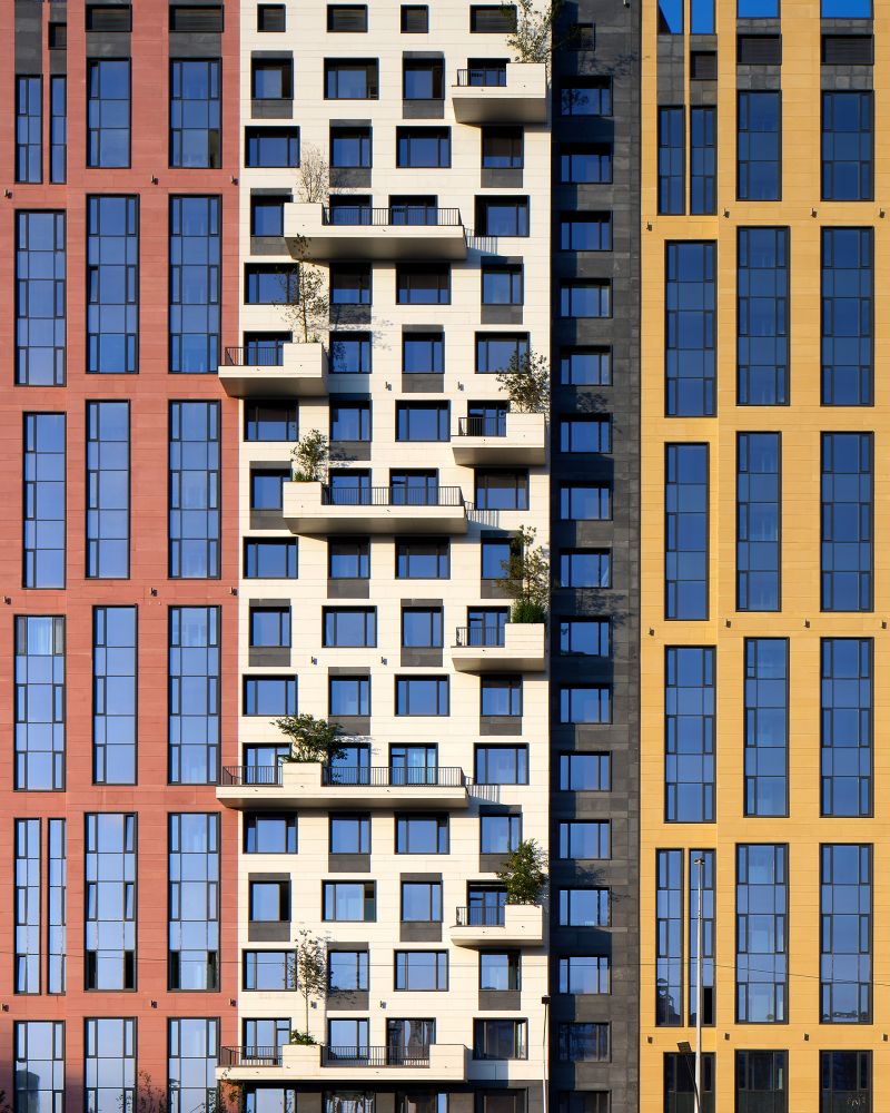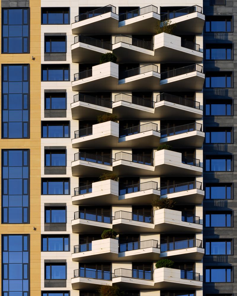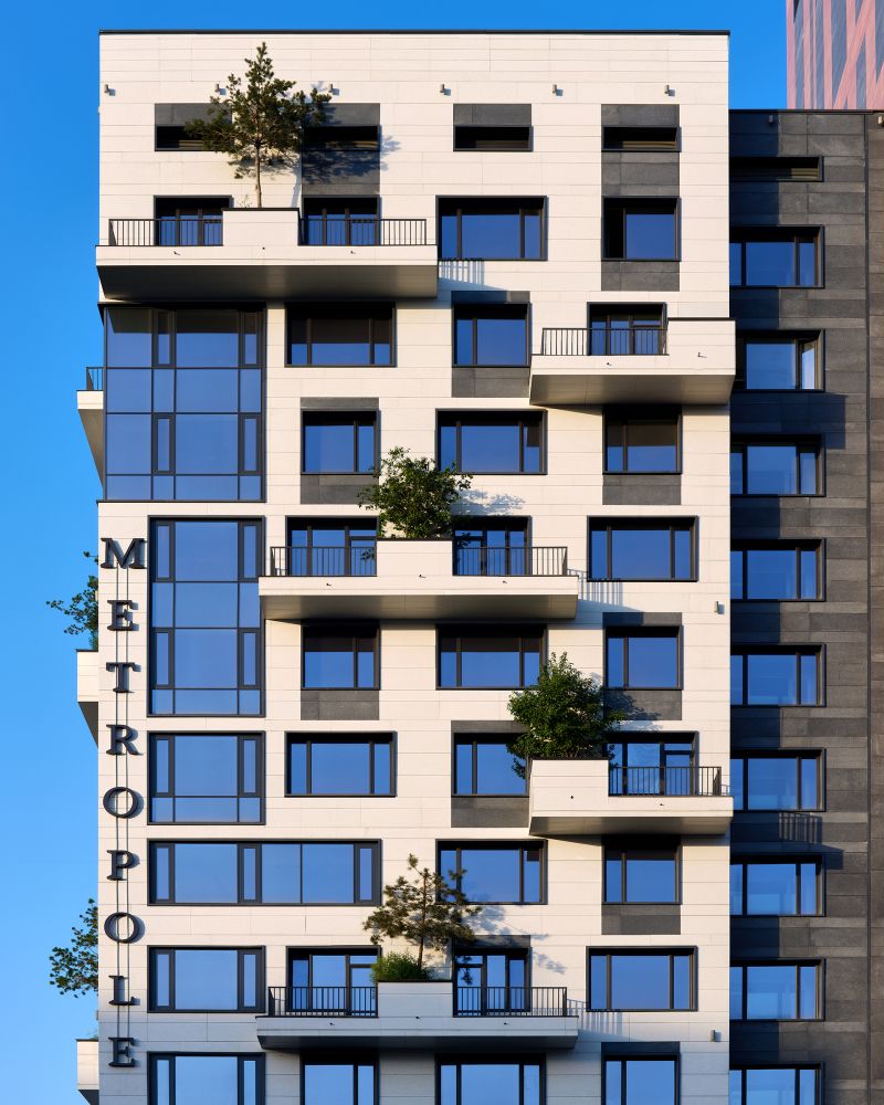 The Metropole residential complex breaks urban monotony with dynamic façades that shift in light and shadow, creating a sense of movement. Cantilevered balconies, inspired by the Hanging Gardens of Babylon, extend as green oases, integrating nature into the city. Each terrace offers a private sanctuary with trees and plants, blending architecture and landscape while evoking harmony and transformation.