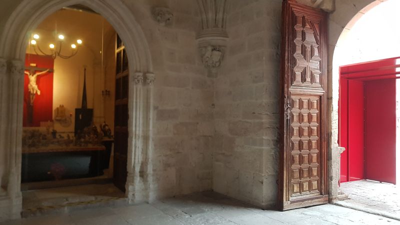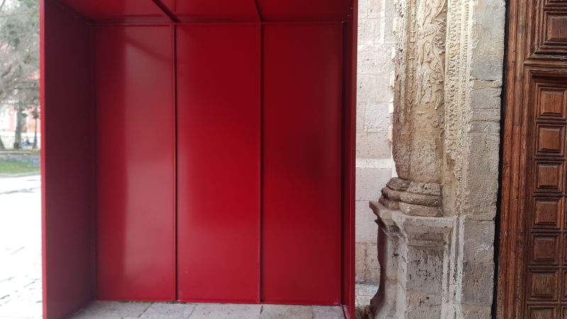 Conceptual correspondence of façade and pavilion. Red background of the Christ