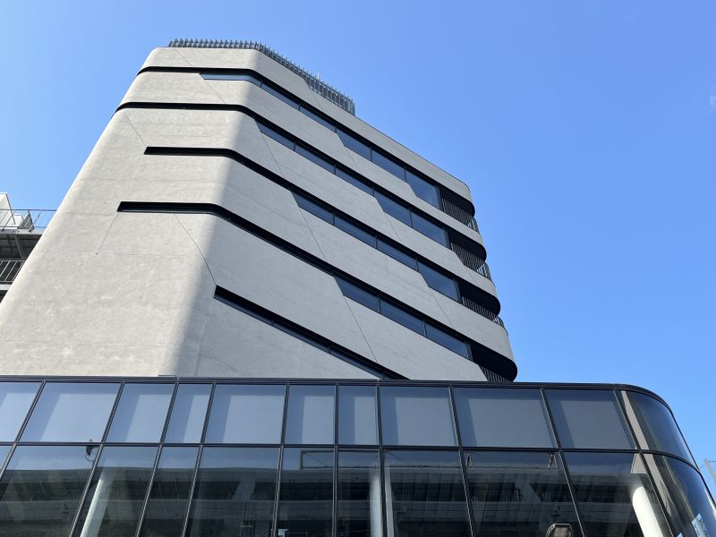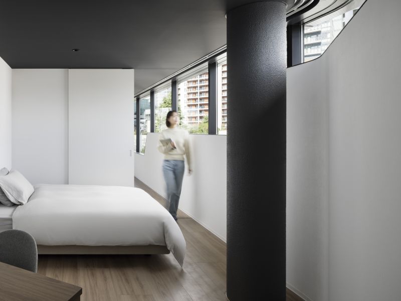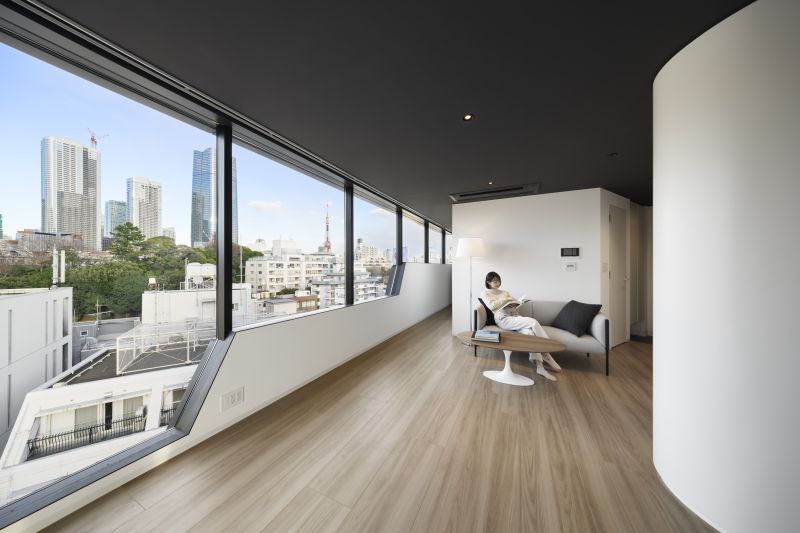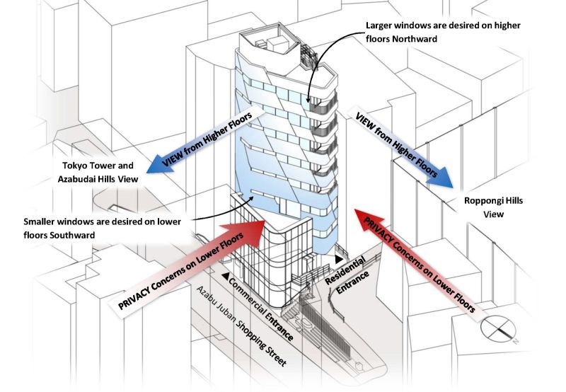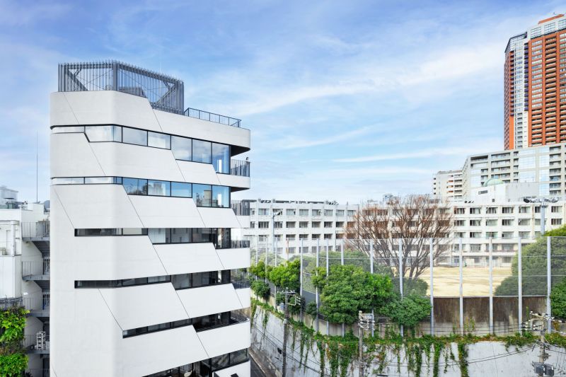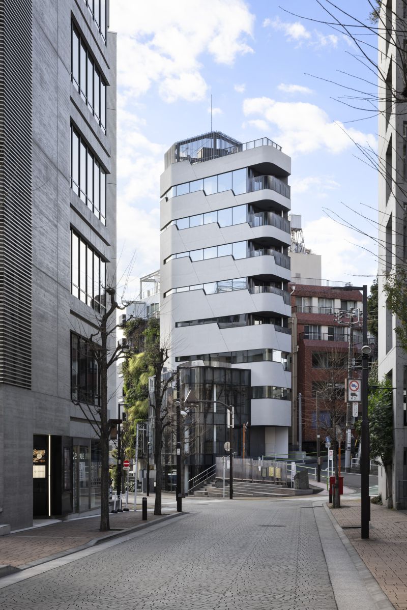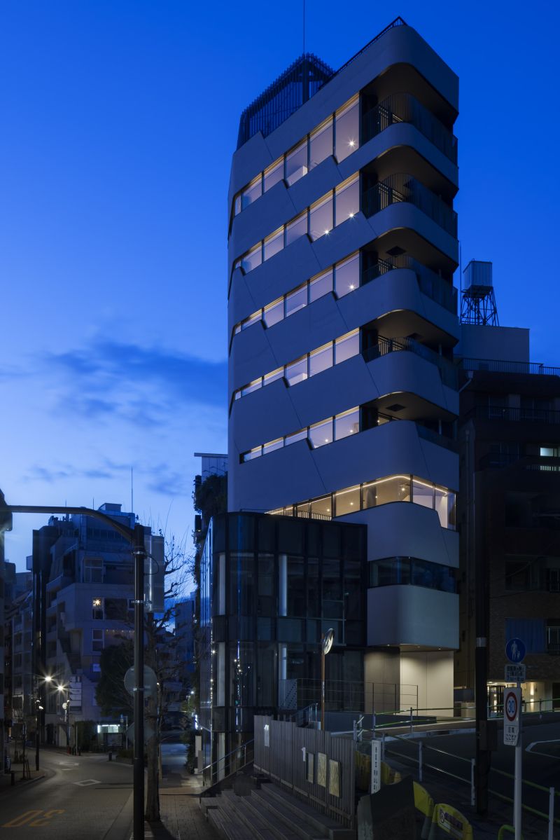 The project is a commercial/residential mixed-use building on a highly visible corner lot in Azabujuban, Tokyo, famous as a bustling commercial area. The building volume is comprised of a 3-story “glass” commercial block on the main street and a 9-story “concrete” residential tower accessed on the 2nd floor from the elevated side street. Its most unique element is a series of “stepped ribbon windows” of the residential floors, designed to provide the optimum balance between great views versus adverse lines of sight from buildings across the street, which can compromise the dweller’s privacy.