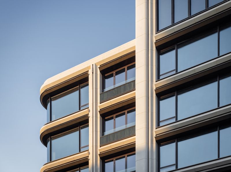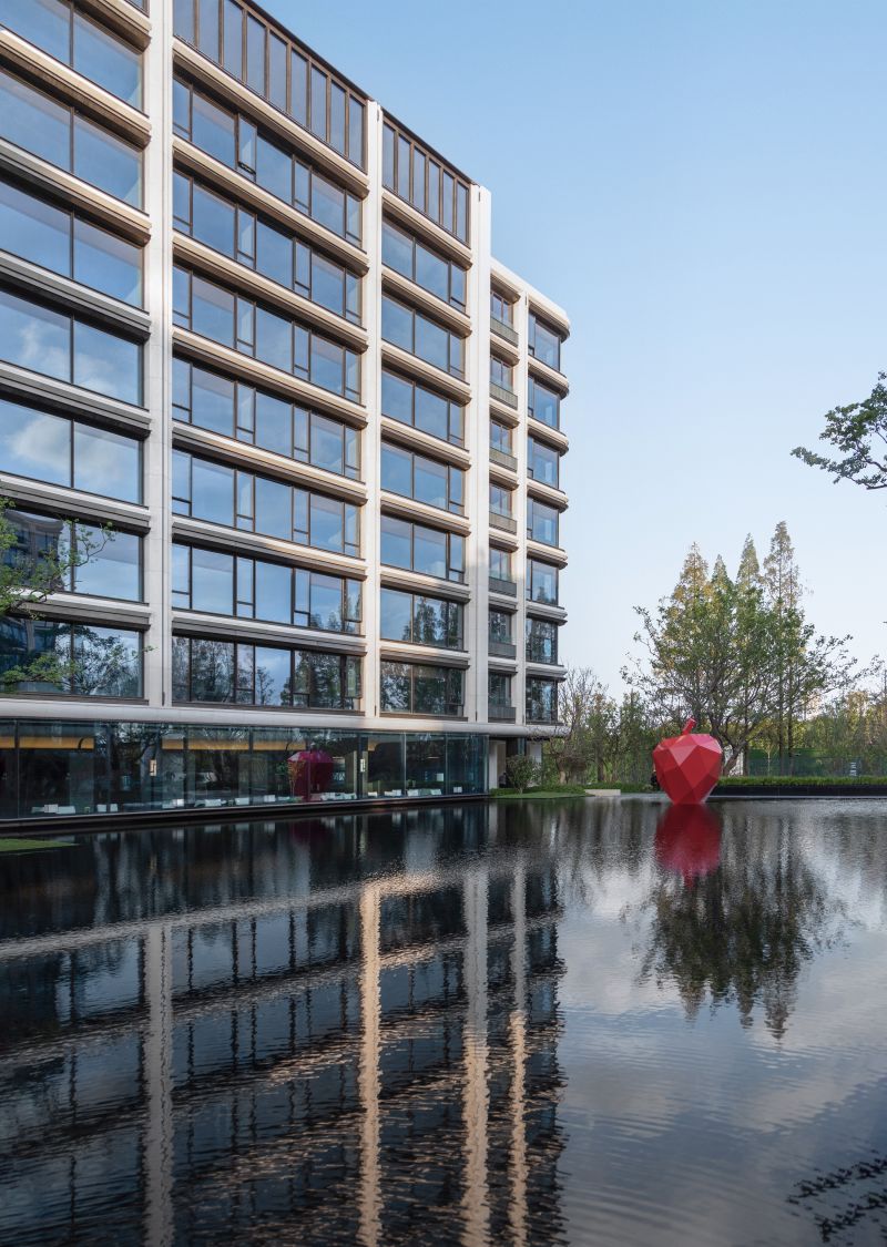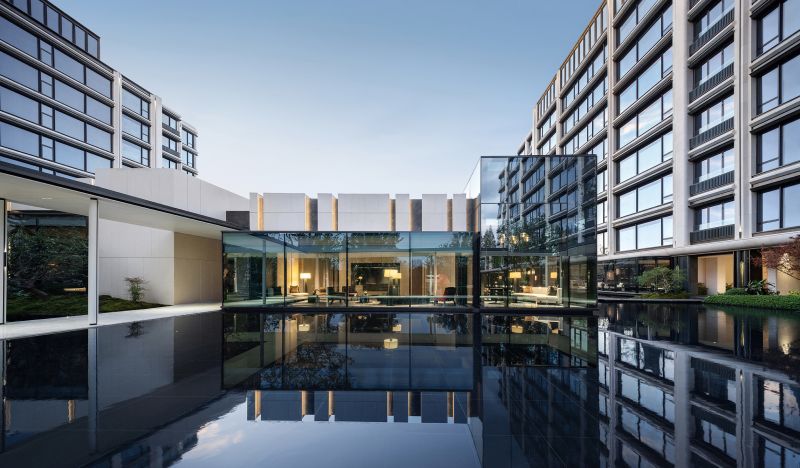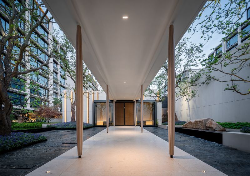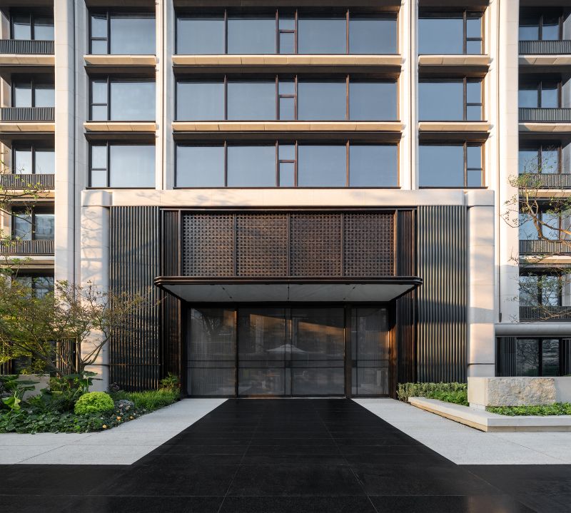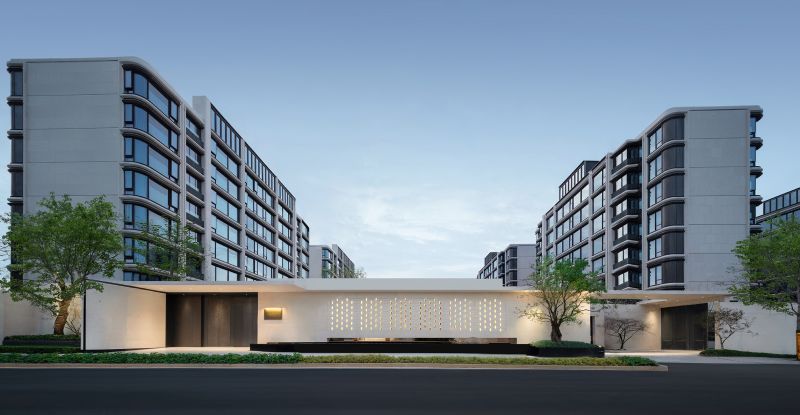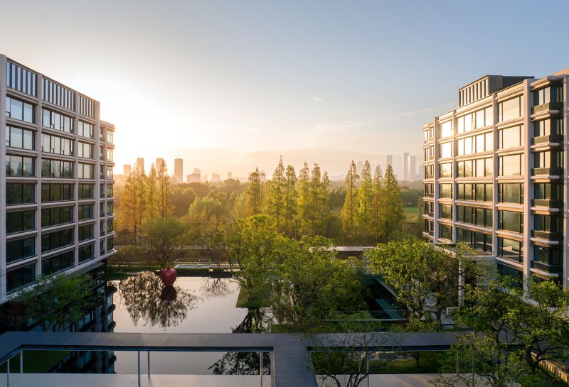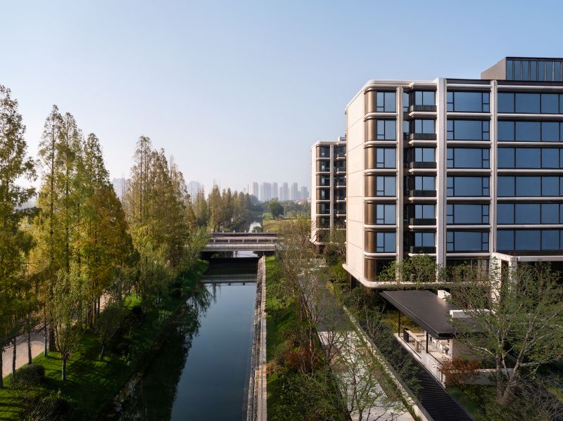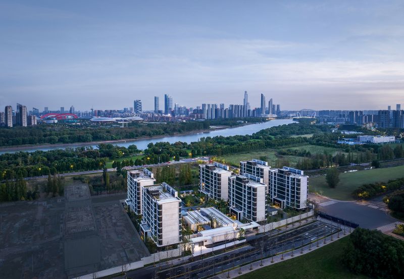 The project, located in Nanjing's Jiangxinzhou area, blends history and modernity, with an emphasis on waterfront living. It features eight residential buildings arranged around a central courtyard, inspired by Nanjing's historical urban fabric. Public spaces include scenic pavilions, tea houses, and bars. The architecture combines robust stone columns with curvilinear elements and bronze accents. Residences include large balconies with green planters, drawing inspiration from Gaudí. The design fosters a harmonious connection between nature, architecture, and community living.
