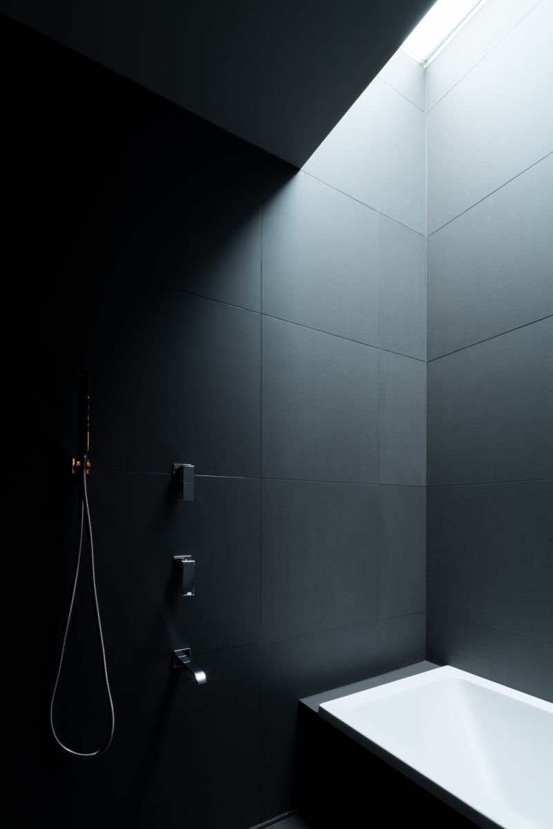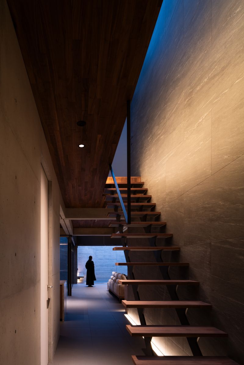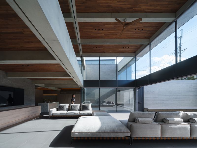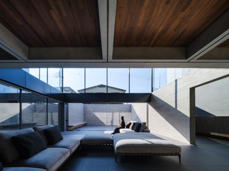 ELEMENT stands in a quiet residential area in the southern part of Kyoto. The L-shaped plot, which faces two roads, features a change in elevation and distinct facades on the north and south sides. The main facade is characterized by a large overhang with a wide southern-facing window, enclosed by a concrete wall imprinted with cedar-board formwork. The secondary façade is distinguished by its powerful cantilevered appearance, which allows for a pilotis-style garage area.