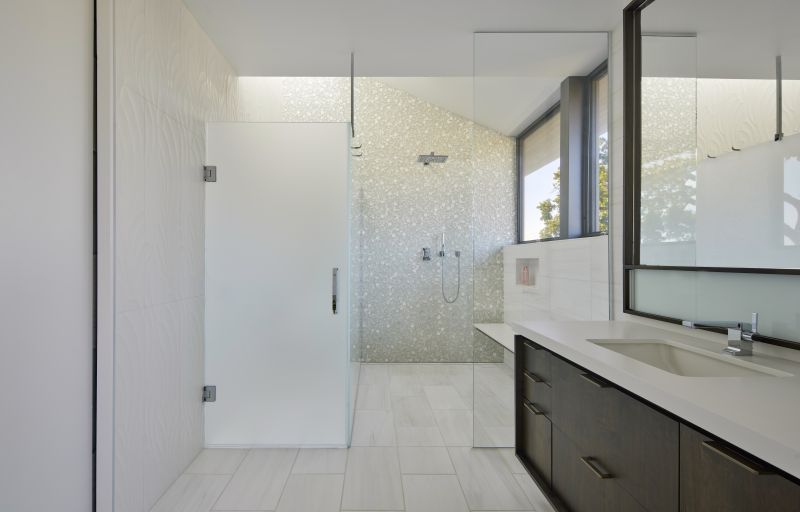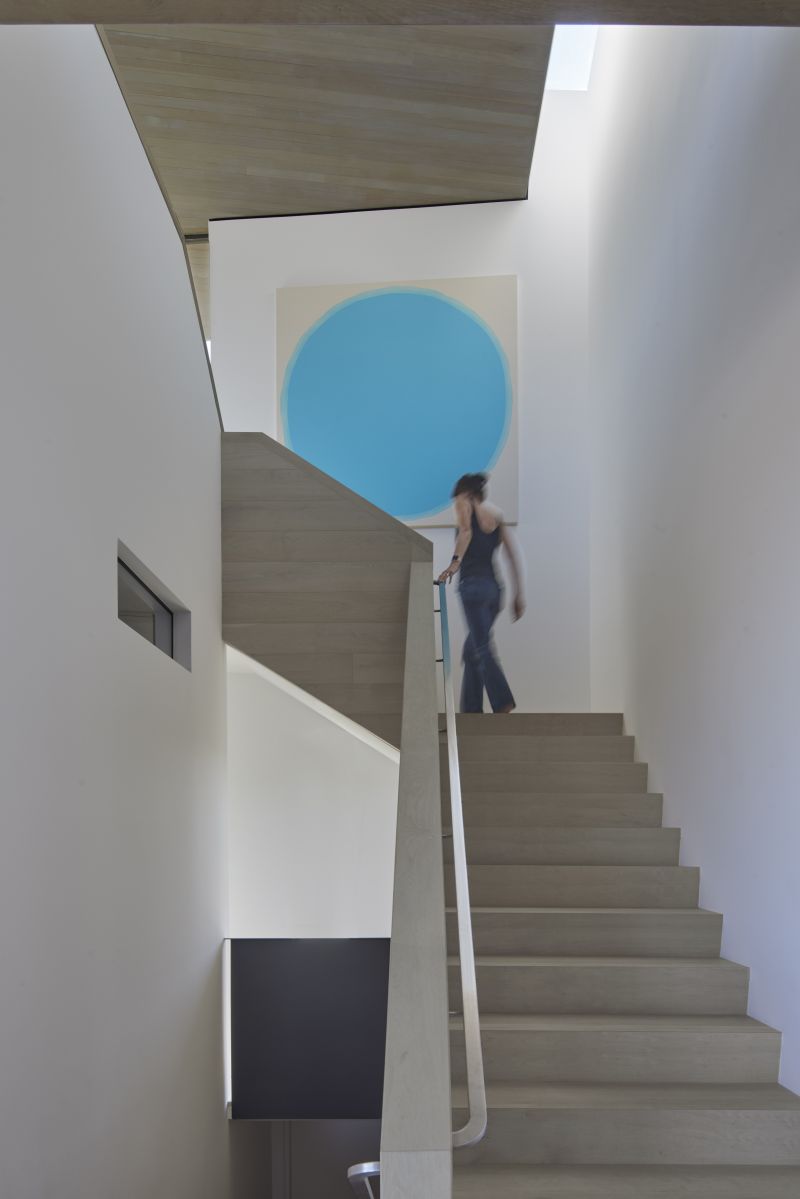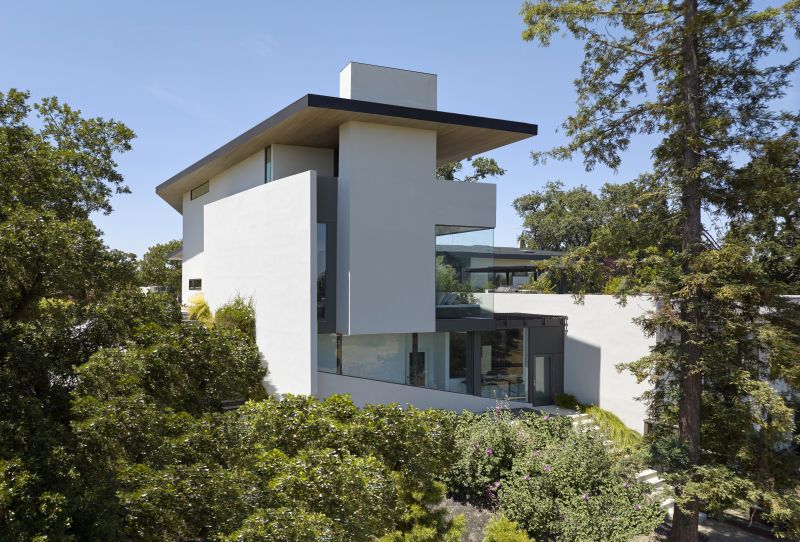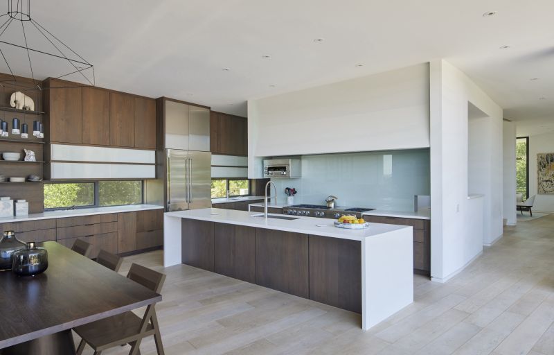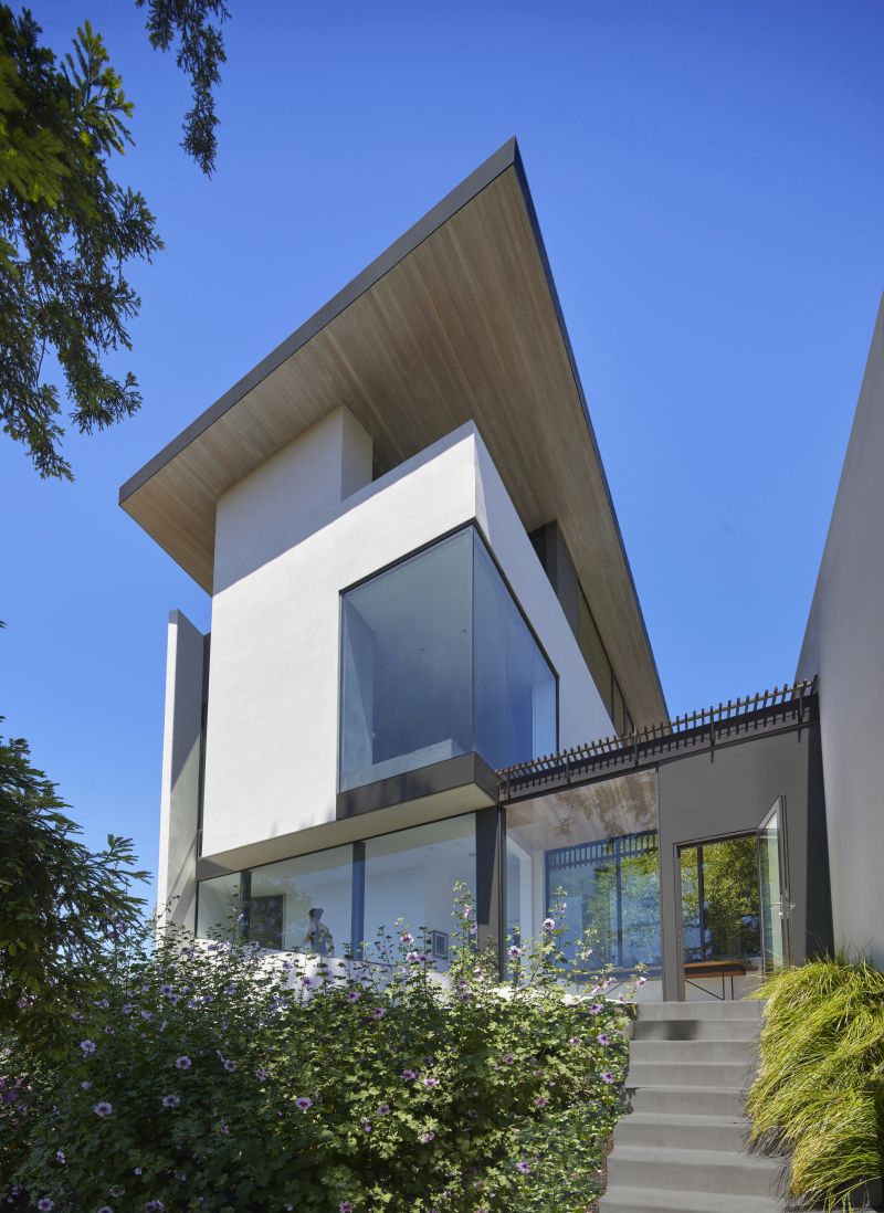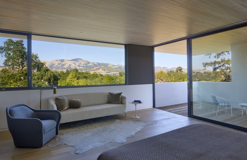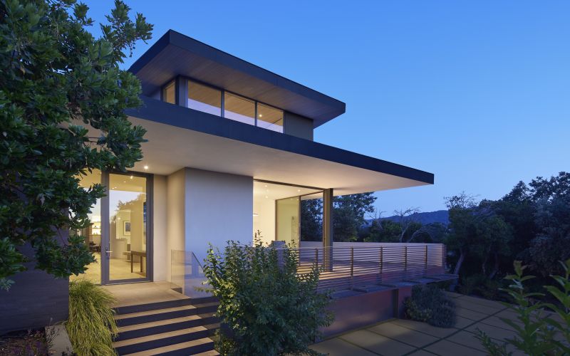 The project entails adding a residential wing to an existing single-story house. The new two-story section connects to the original house at an acute angle, enhancing the intersecting space by intersecting it with the landscape and distant views. The open-plan layout facilitates a seamless flow between the spaces. The heart of the house is connected to the outdoor living areas through floor-to-ceiling glass walls that gently curve around the main deck, improving views of the surrounding landscape.