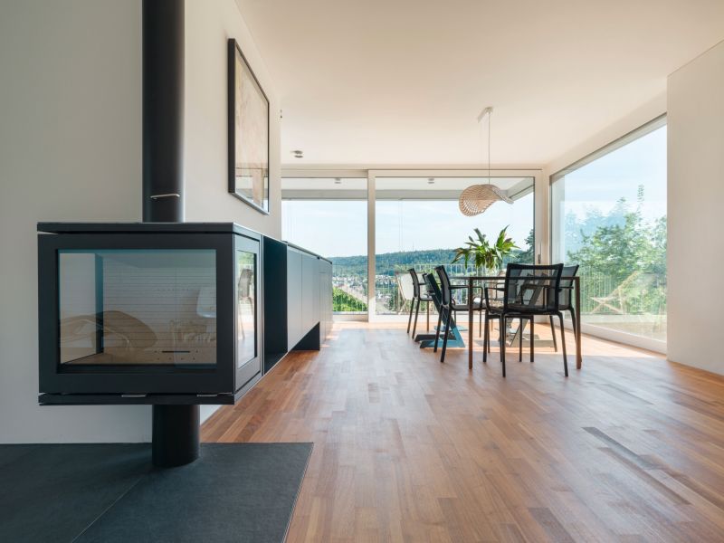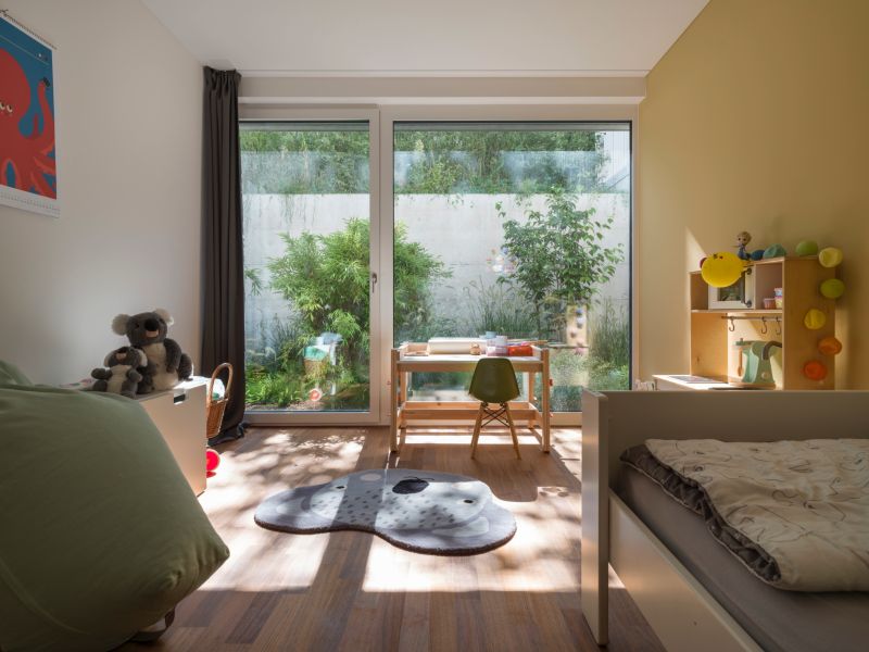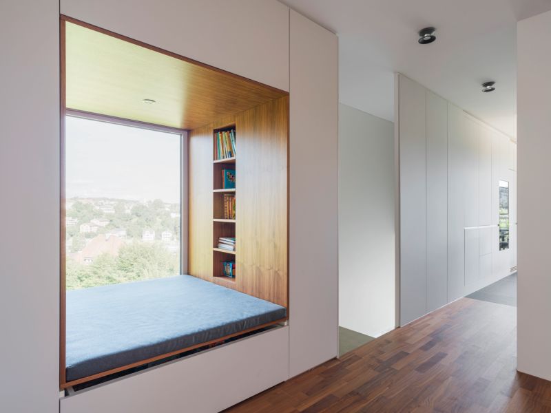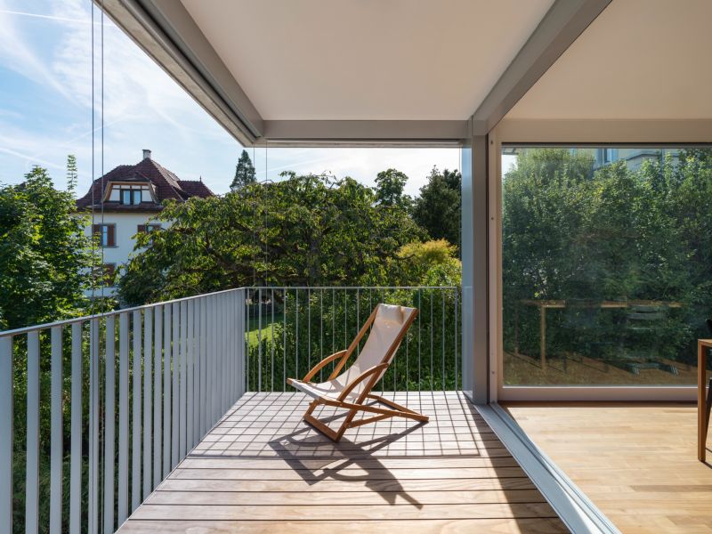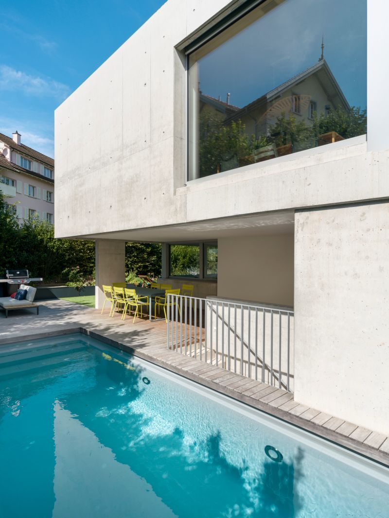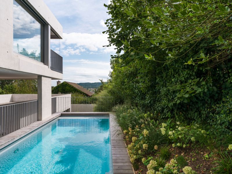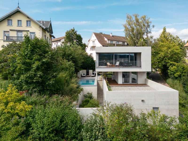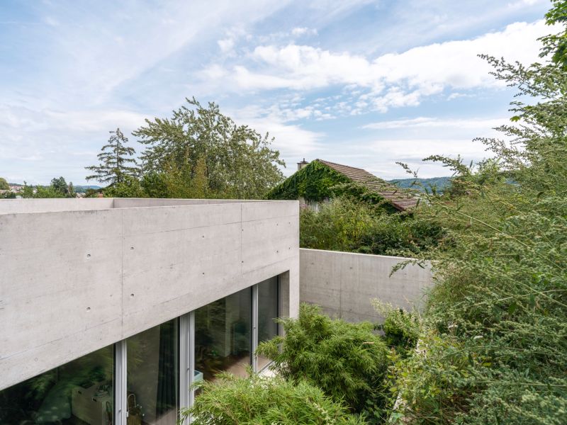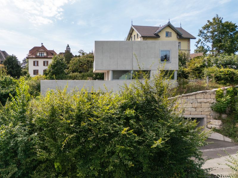 Nestled on a hillside above Schaffhausen’s historic old town, the distinctive residential building at Weinsteig seamlessly integrates into its surroundings filling the void of the previous building through a staggered cubic design. The building’s four levels follow the natural slope, creating dynamic spatial experiences, from a private courtyard to expansive garden terraces. A robust, rectangular concrete exterior contrasts with the softer, inviting interiors. The design respects the local context, with a restored dry stone wall marking the entry, blending surroundings with modern architecture