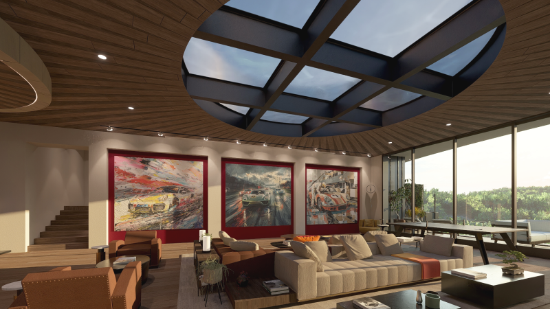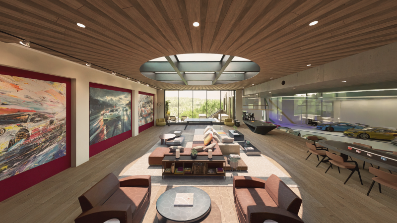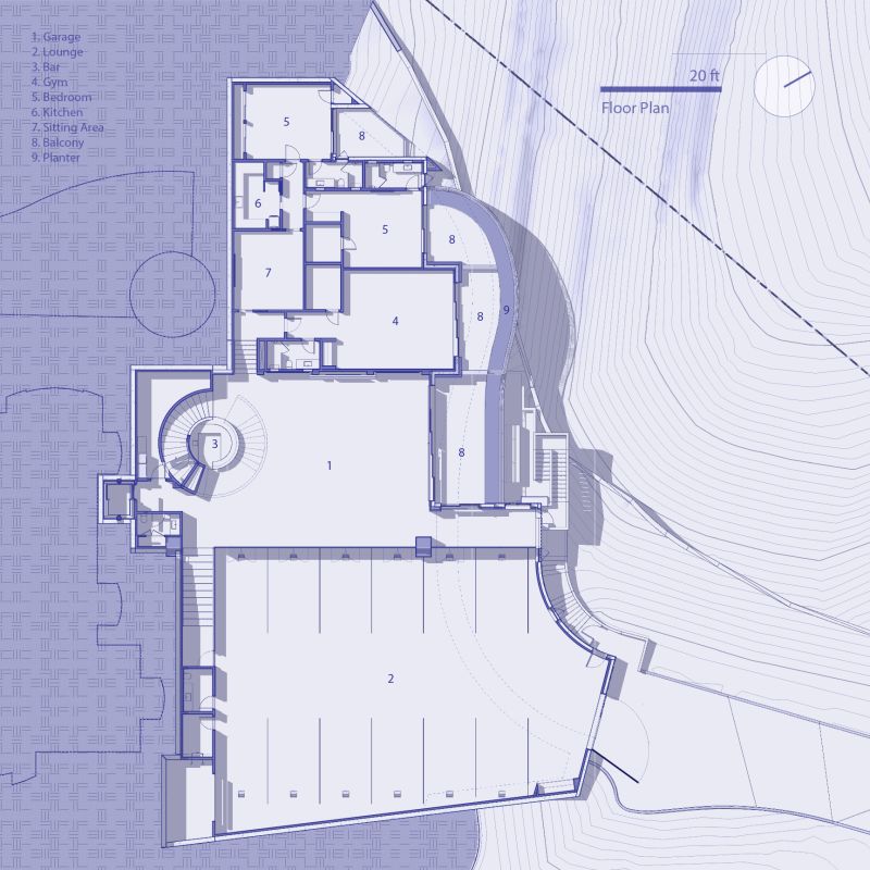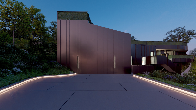 Carved into the Los Angeles hillside, this subterranean residence transforms zoning constraints into opportunity, merging architecture with terrain. Curved, cantilevered planters extend the landscape, while the concrete structure and skylit water feature enhance resilience and sustainability. Channel Glass, natural ventilation, and green roof strategies minimize visual and environmental impact, creating hidden, sculptural retreat that defines hillside living.