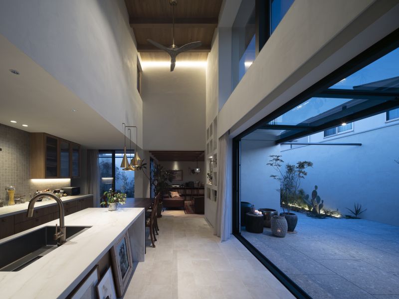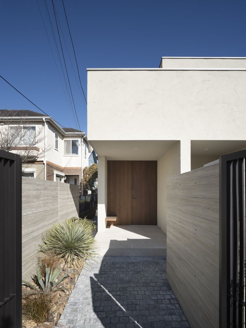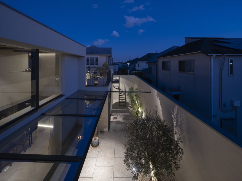 This house stands on a flagpole site in a quiet residential area. The key to the design was how to make the most of the spacious site of 100 tsubo (approx. 330 m2). They were also fascinated by the architecture of Morocco, where they traveled, and wanted to incorporate that atmosphere.