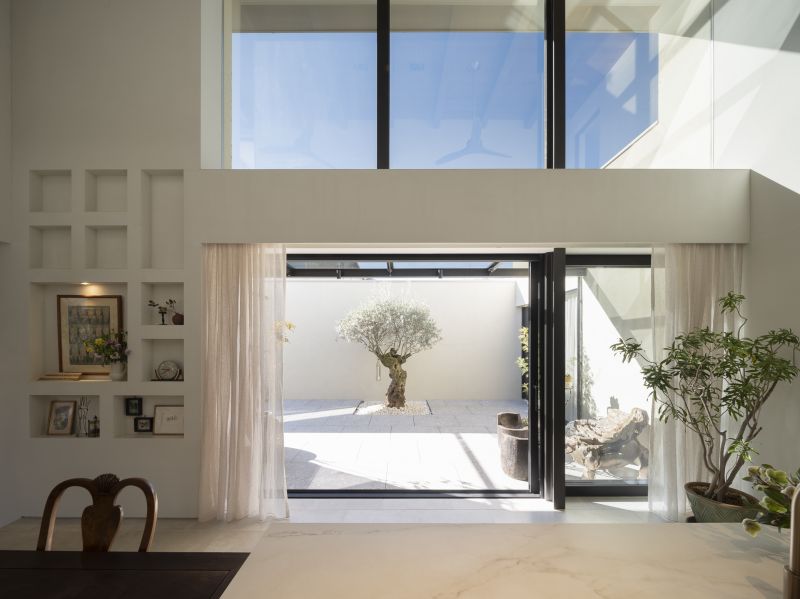 Rather than a simple courthouse that surrounds the center, the garden is scattered in various places on the site, so that each room can access the outside space.