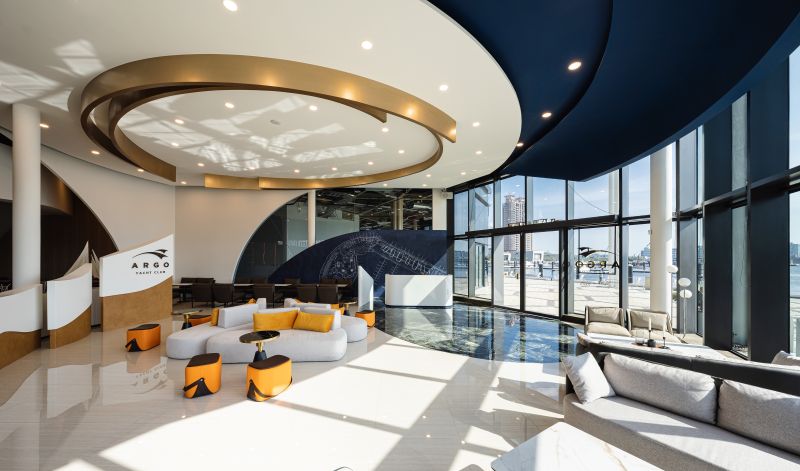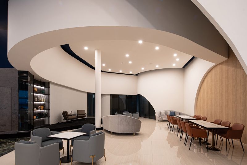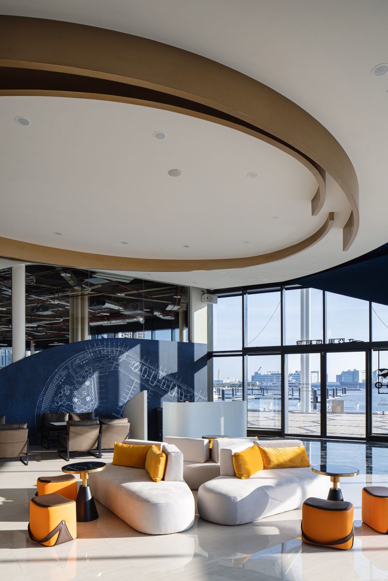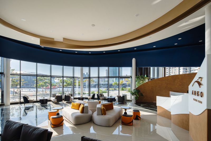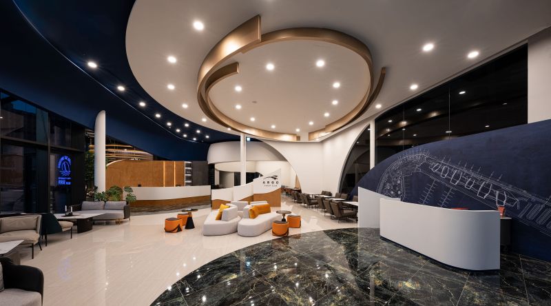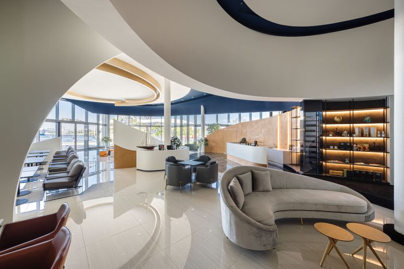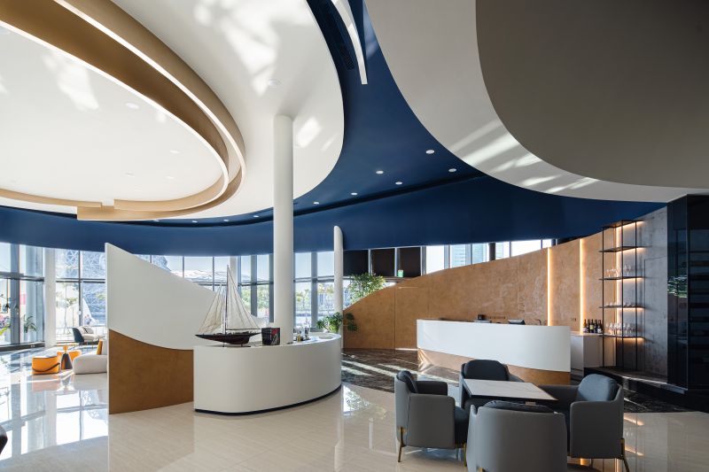 Layered arc walls soften the building’s original geometric edges, guiding movement like ocean currents. Anchored in the imagery of the sailboat, its palette draws from deep ocean blue and warm ivory, accented by touches of golden sand. An open-plan layout connects the reception, lounge, and meeting areas through gracefully curved pathways, creating a spatial experience that flows as naturally as ocean currents. The design team carefully selected durable, low-maintenance, and eco-friendly materials to minimize the need for frequent renovation, thus decreasing resource waste.