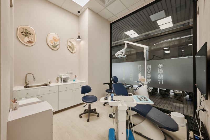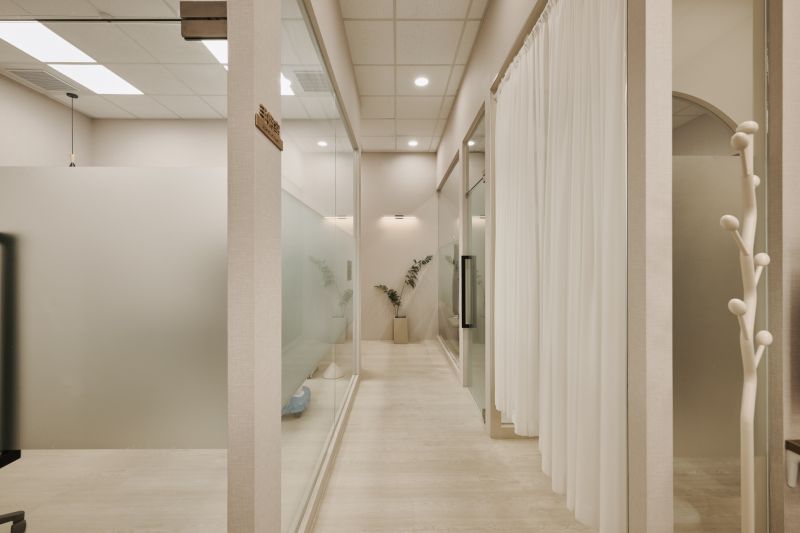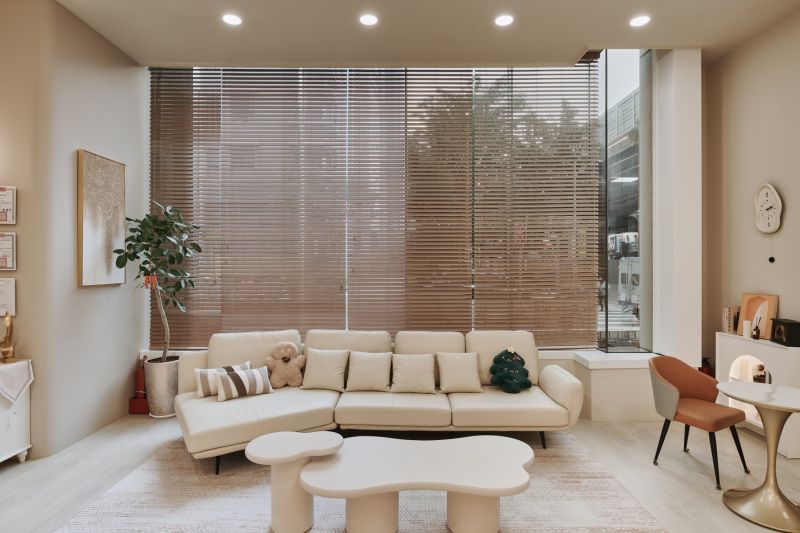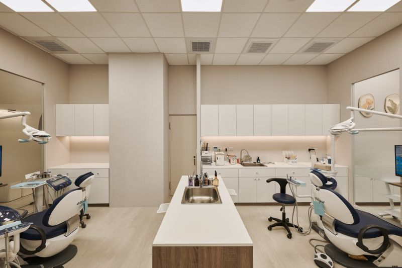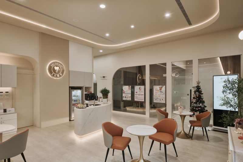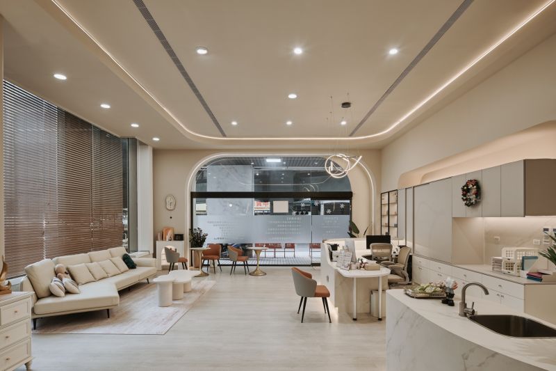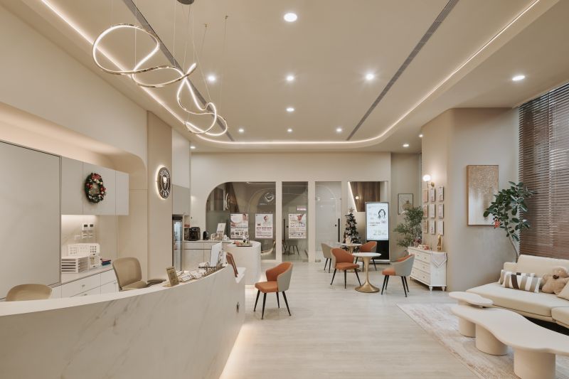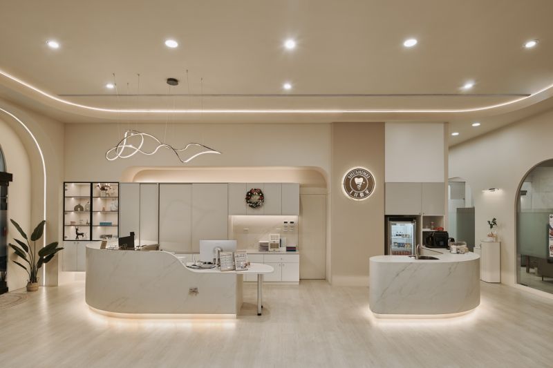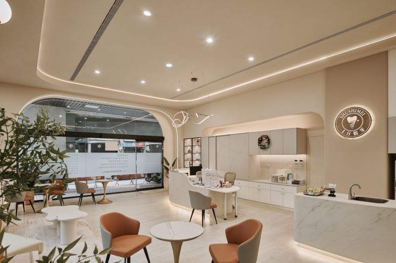 As you enter the dental space, which is located in a mixed office and residential neighbourhood, you are greeted by sunlight through the large apricot-coloured wooden blinds, and the smooth curved ceiling with linear and downlighting, which is 4.2 metres in height, is complemented by the curved interior design of the entrance, creating a welcoming and embracing feel. Unlike traditional dental clinics that are cold and oppressive.