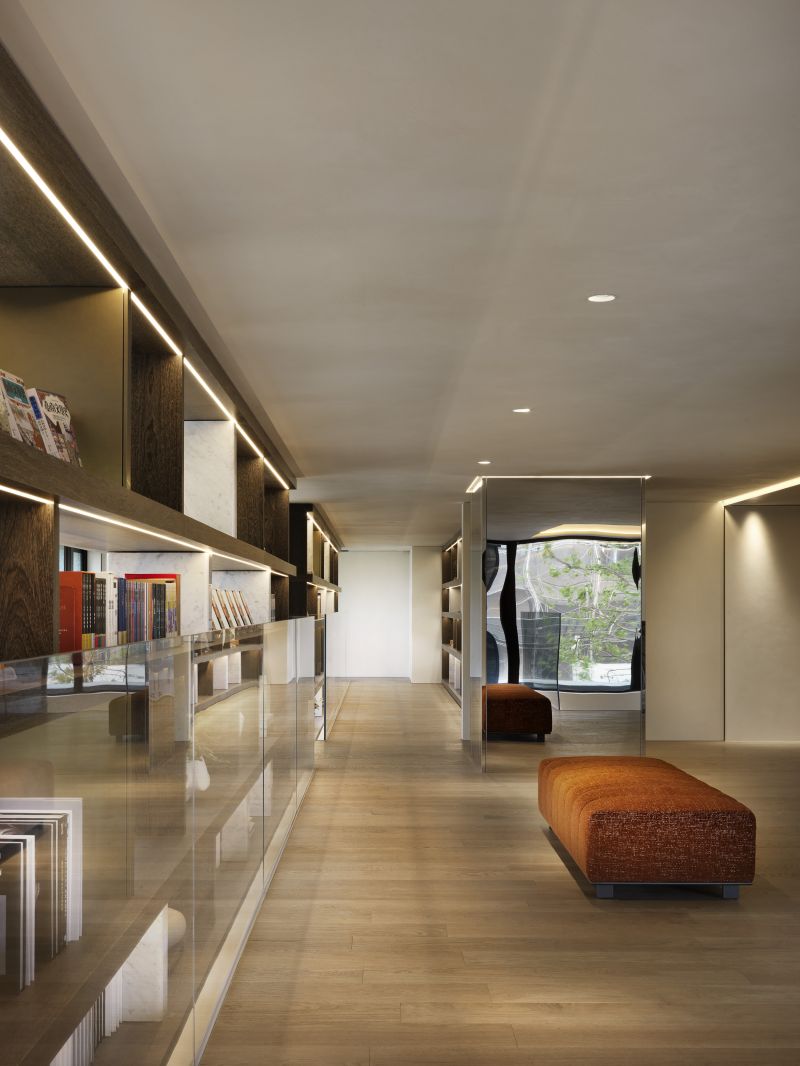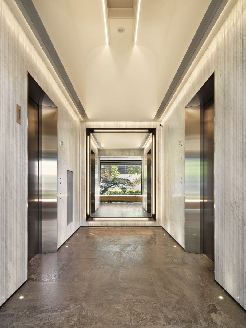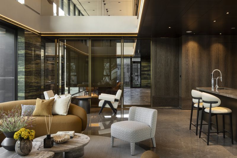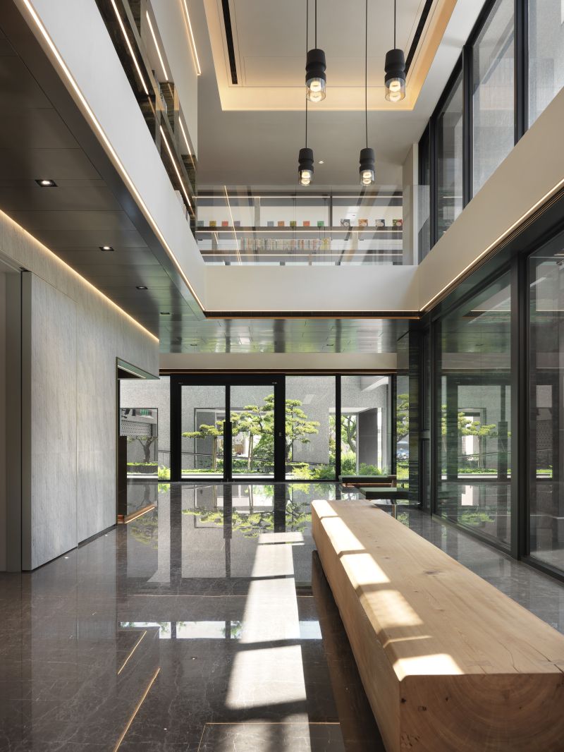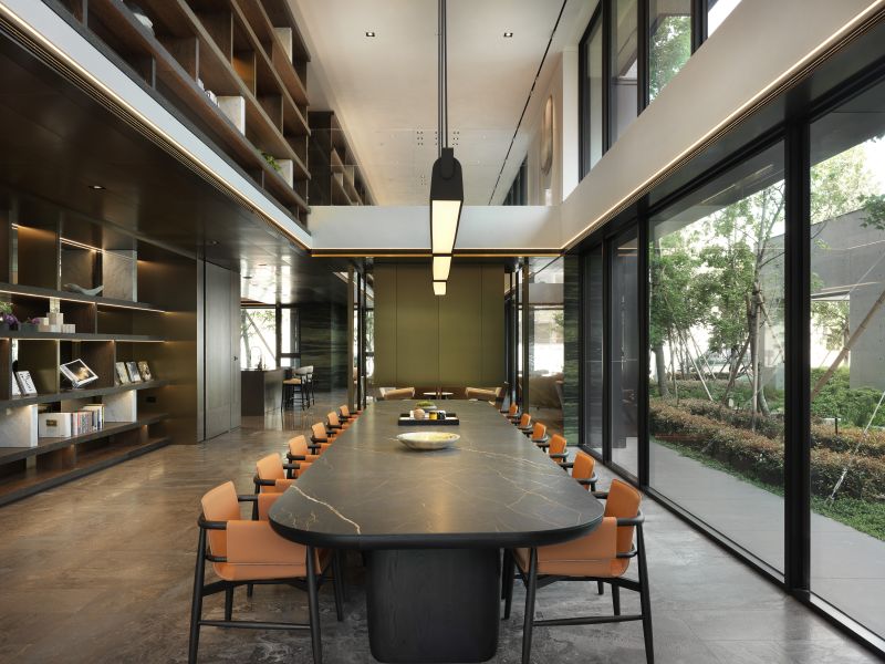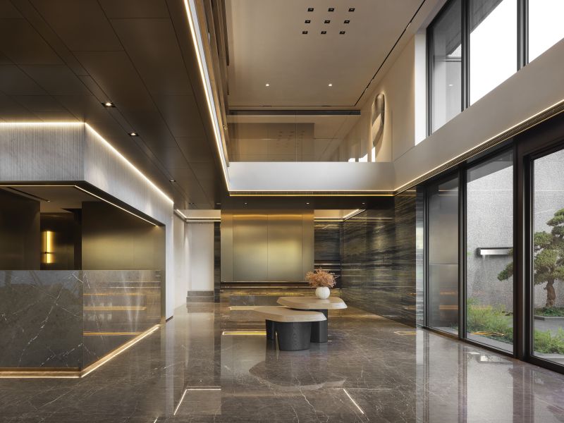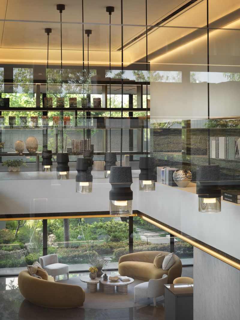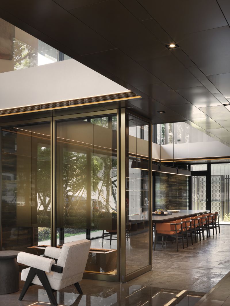 The design of the common areas in this property beautifully embodies the theme of "Boundless Symbiosis," aiming to seamlessly dissolve the boundaries between humans and nature, as well as architecture and the environment. To this end, the space features soaring ceilings and expansive, multi-layered translucent glass, which invite abundant natural light while providing stunning views of the outdoors. As a result, elements such as sunlight, tranquil water features, and lush greenery are effortlessly woven into the interior landscape.