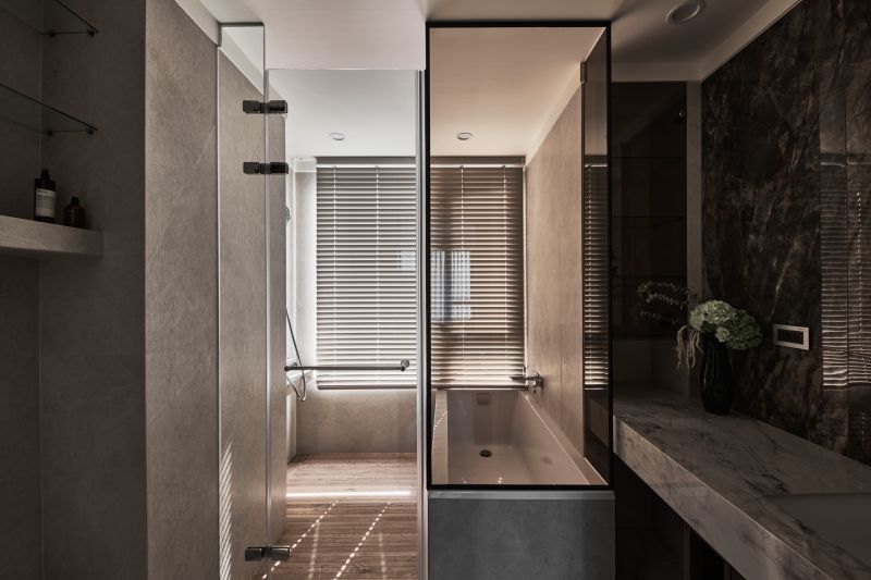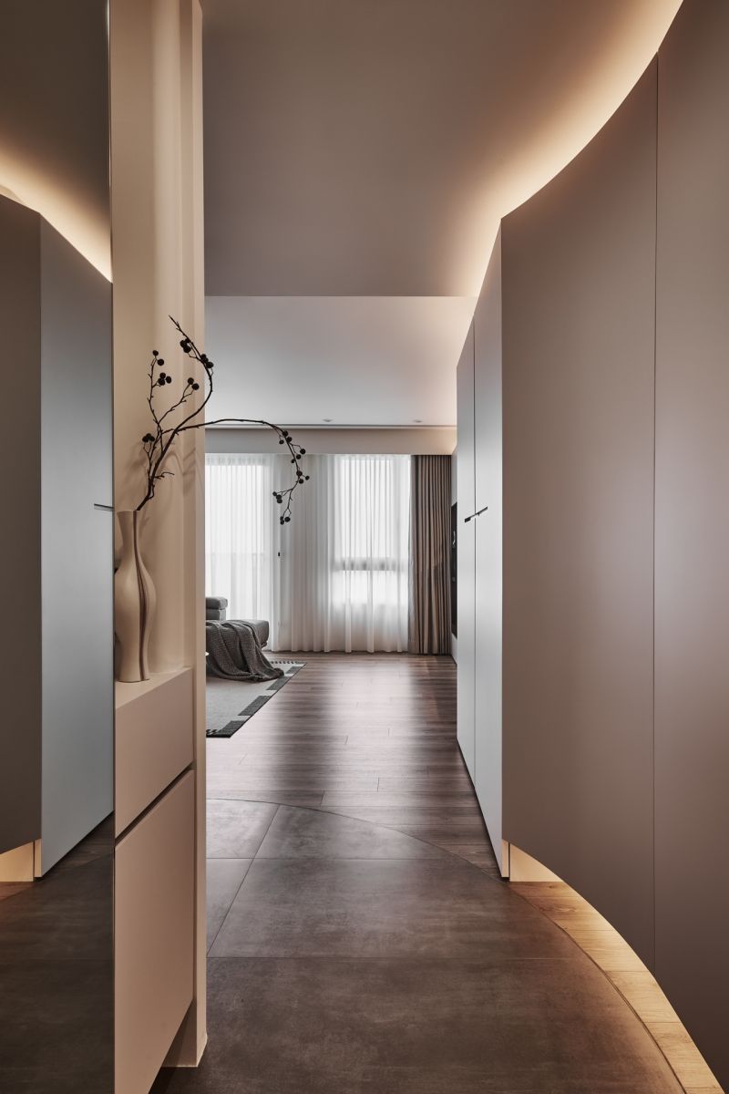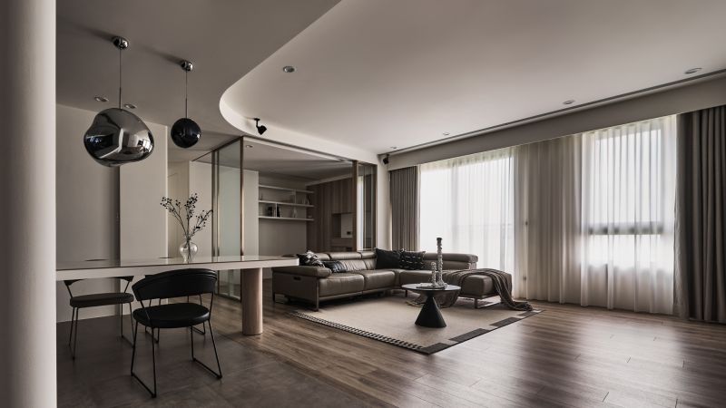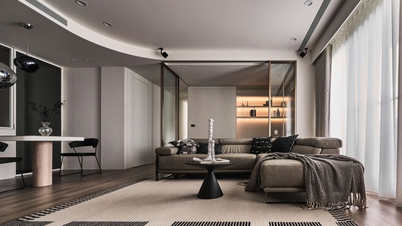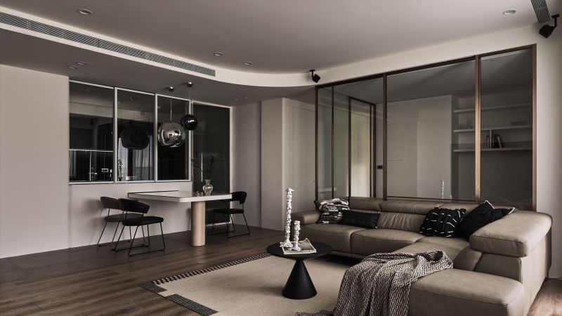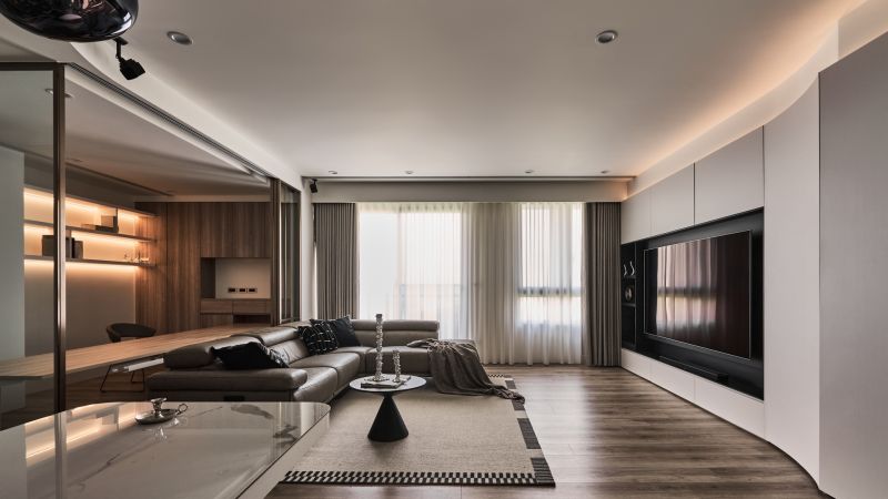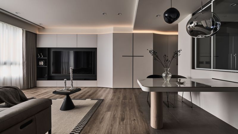 A profound interplay of black, gray, and white oozes minimalist yet understated charms. Natural and indirect light gracefully permeates every dimension of the space, harmonizing humans with their environment, materials, and design. Within the framework of modern style, the perfect amount of wood accents can add a sense of warmth, infusing the rational design with a subtle layer of human touch. The flowing curves of the cabinet lead to a TV wall with a deep, ink-toned base, creating a striking contrast between the soft purity of white and the profound richness of darker tones.
