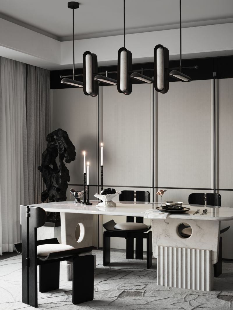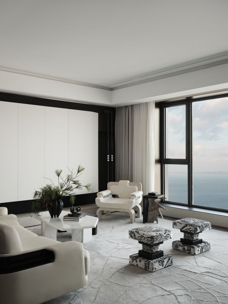 The sea unfolds as an eternal scroll of inspiration, merging with Dalian’s maritime soul. From oceanic heritage, we distill and reinterpret symbolic codes that resonate with elite sensibilities—transcending temporal and spatial confines through fluid architectural dialogue. Life’s vignettes unfurl in an open-plan triad of lounge, dining, and kitchen, celebrating the raw vitality of nature. Foliage, wood, stone, and water textures are woven into furnishings, their organic tactility immersing the space in unadulterated serenity.