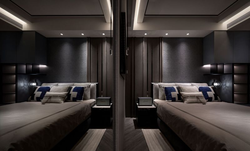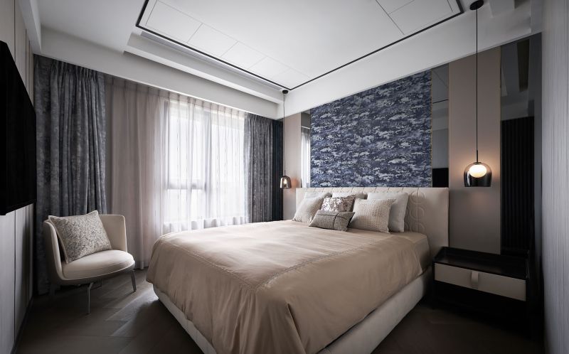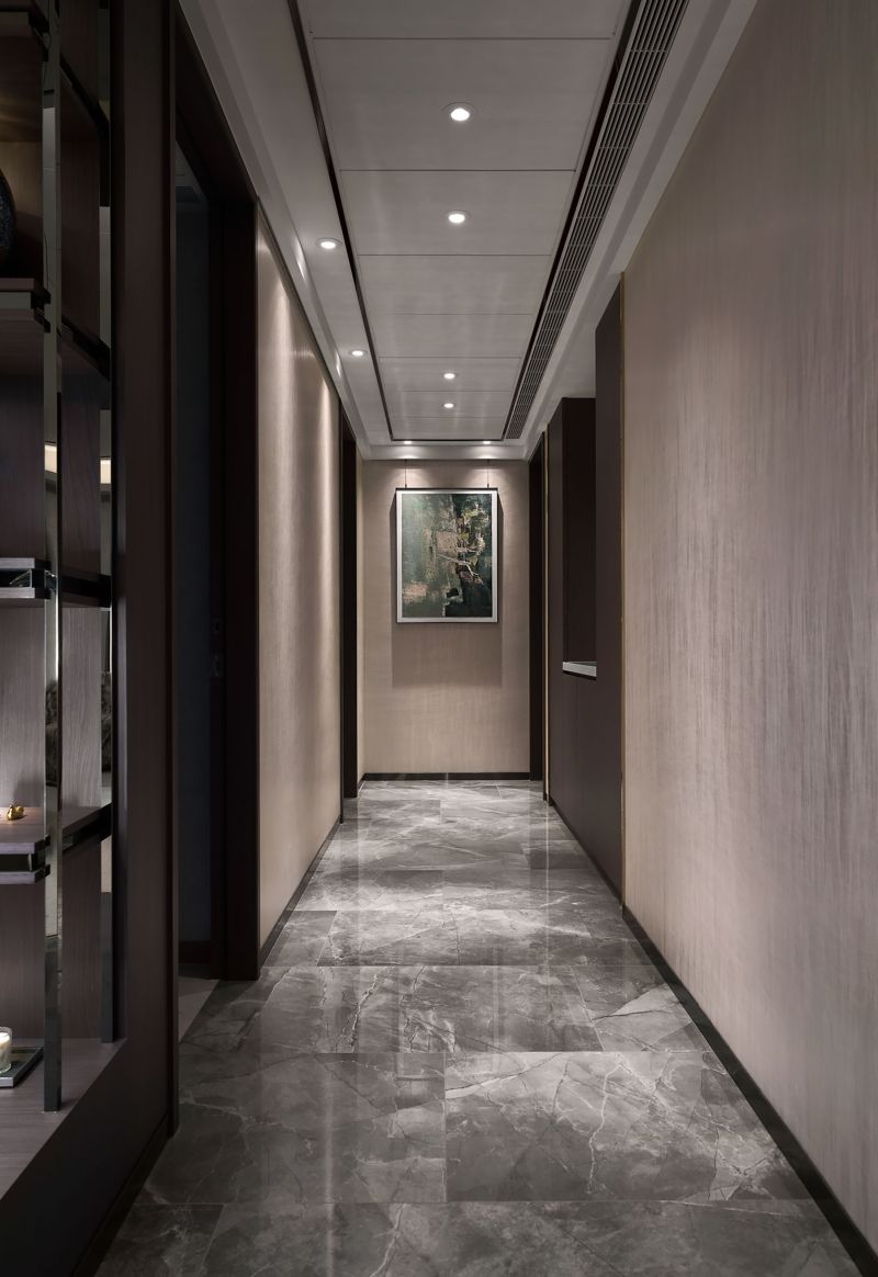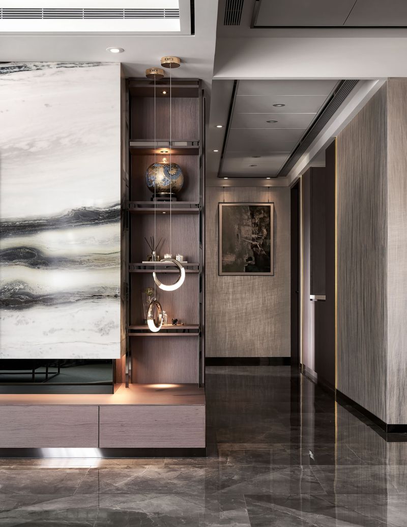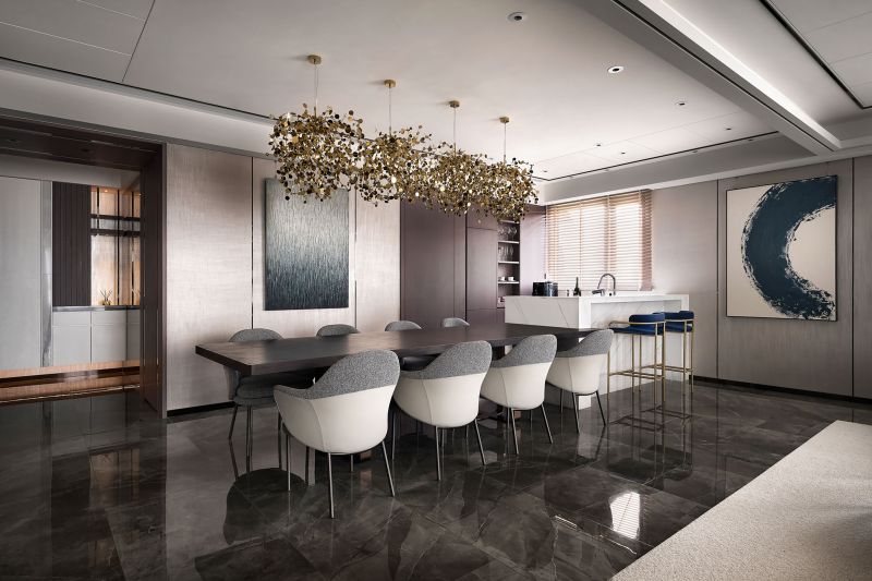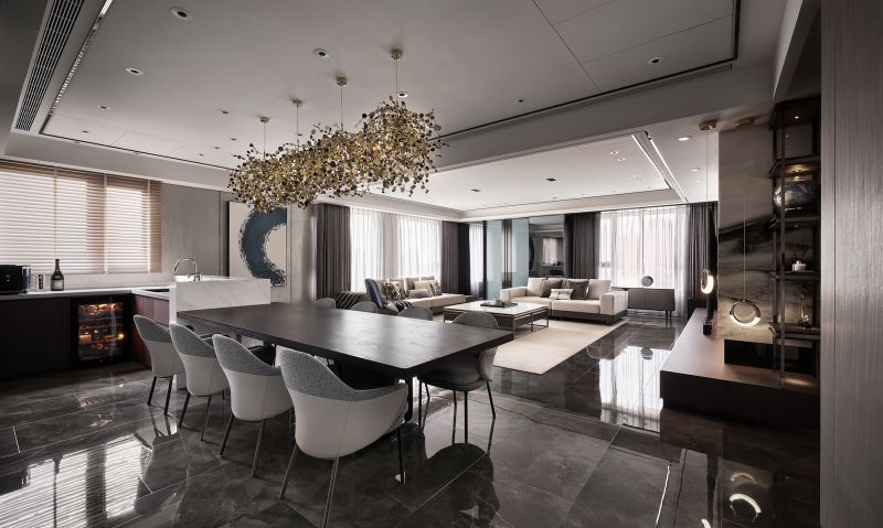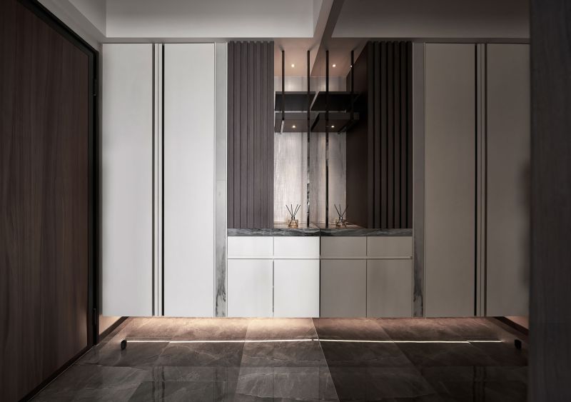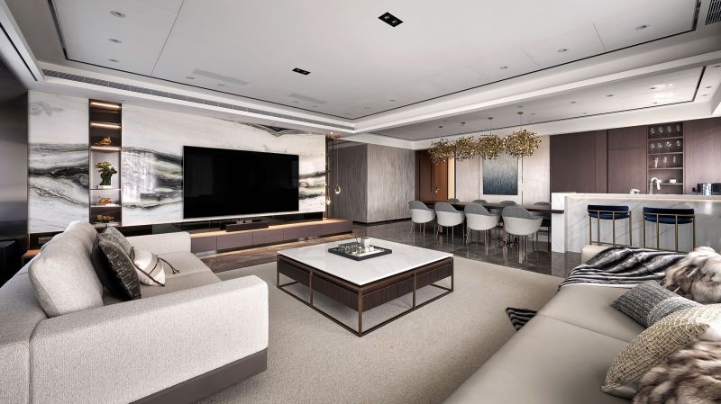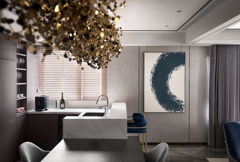 The design team establishes a welcoming foundation in warm gray tones for communal areas, an artful interplay of soft gray tones and titanium-plated accents shapes a serene urban sanctuary, where warm wood surfaces introduce a comforting depth and natural warmth. This project emphasizes open communal space, skillfully utilizing the combined layout of two units to enhance spaciousness that meets the family’s desire for connection. Guided by a commitment to environmental sustainability, the team carefully selected low-formaldehyde, low-VOC materials.