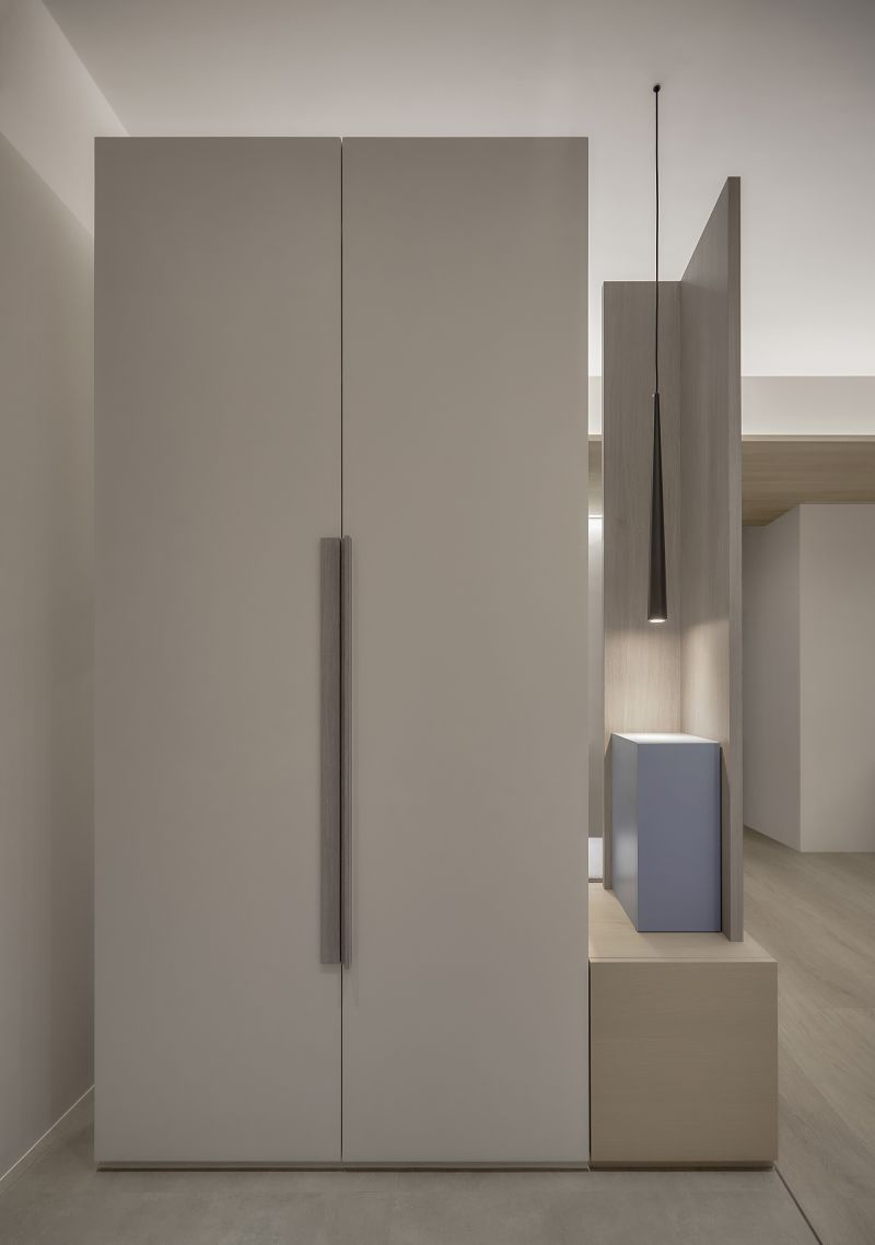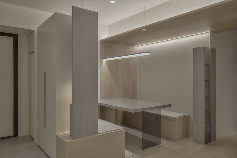 This residential planning project artfully combines a warm wood texture with soft beige tones, resulting in an inviting atmosphere that is both calm and vibrant. The design is characterized by a harmonious interplay of layered geometric structures, which are thoughtfully arranged in an asymmetrical pattern. This approach not only defines clear spatial contours but also enhances the visual interest of the space.Moreover, the intersecting lines create a simple yet orderly layout that highlights the essence of modern style while seamlessly integrating necessary functionality.