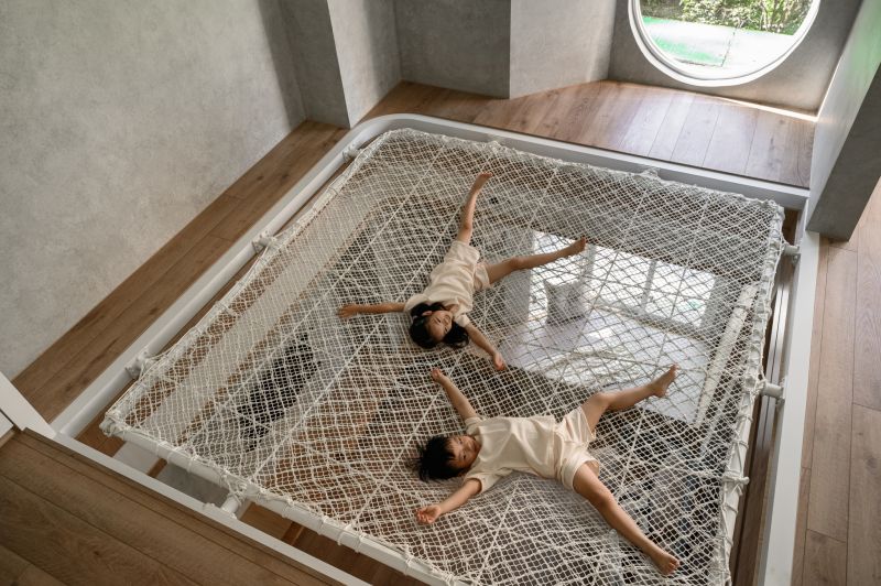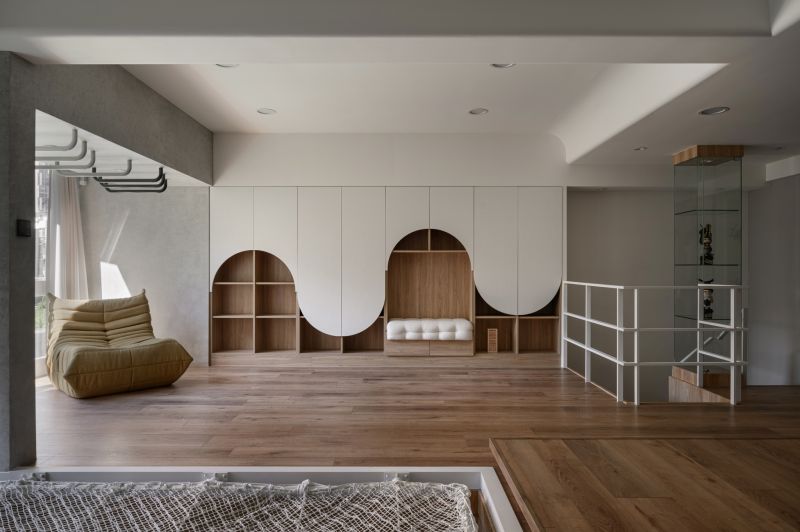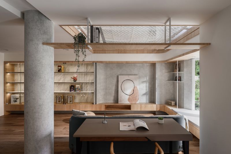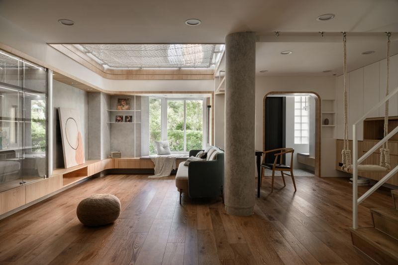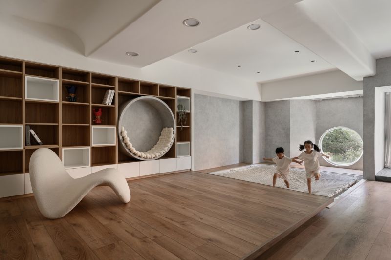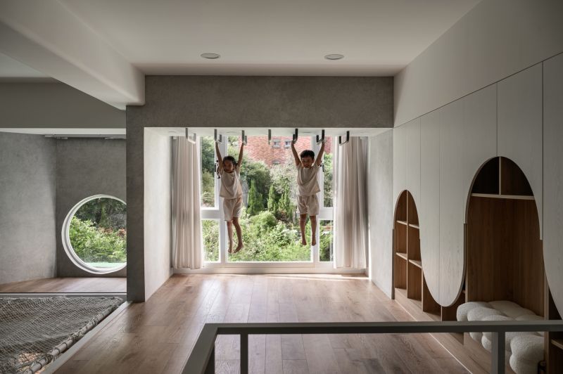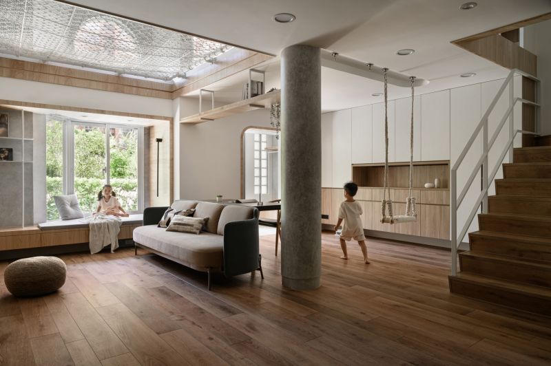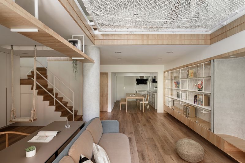 In the duplex layout, we aim to turn the typical residence into a wonderland for children to grow up and have a happy childhood. First, the partitions and floor slabs are removed to create a sense of transparency vertically. Thanks to the open layout, windows bring lush greenery into the entire space. Secondly, the household equipment and furniture are placed against the wall. The staircase with twists and turns offers a spacious space to walk up and down. Finally, a swing, a climbing net, bars, and seats in different shapes create a fun-filled, functional environment for kids.