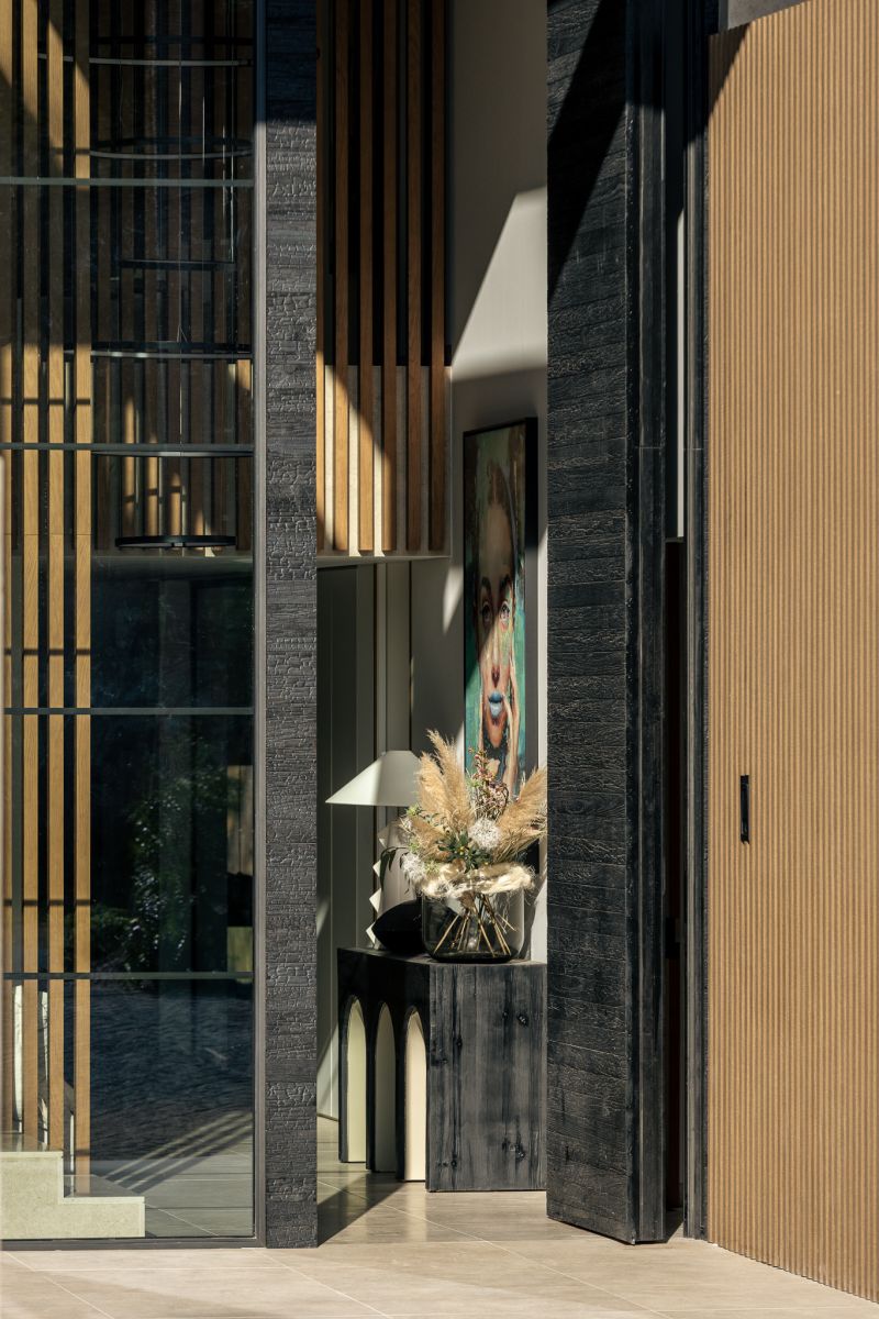 The interior architecture is defined by a rich layering of textures and materials—natural stone, warm wood,