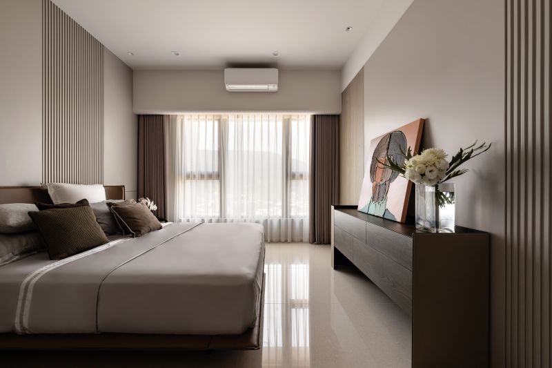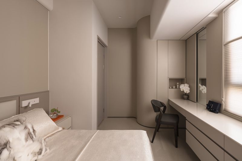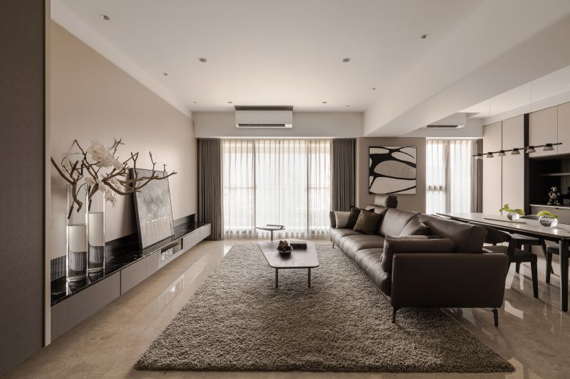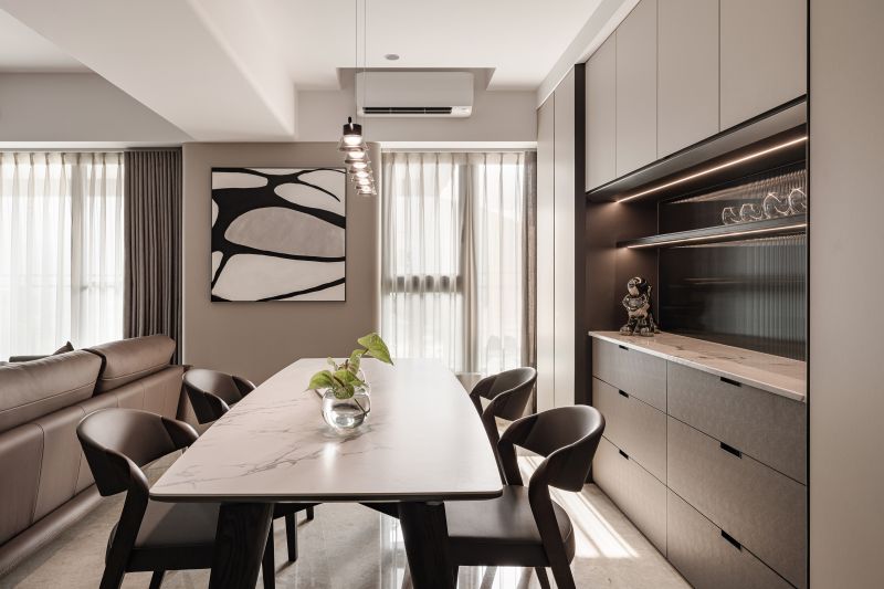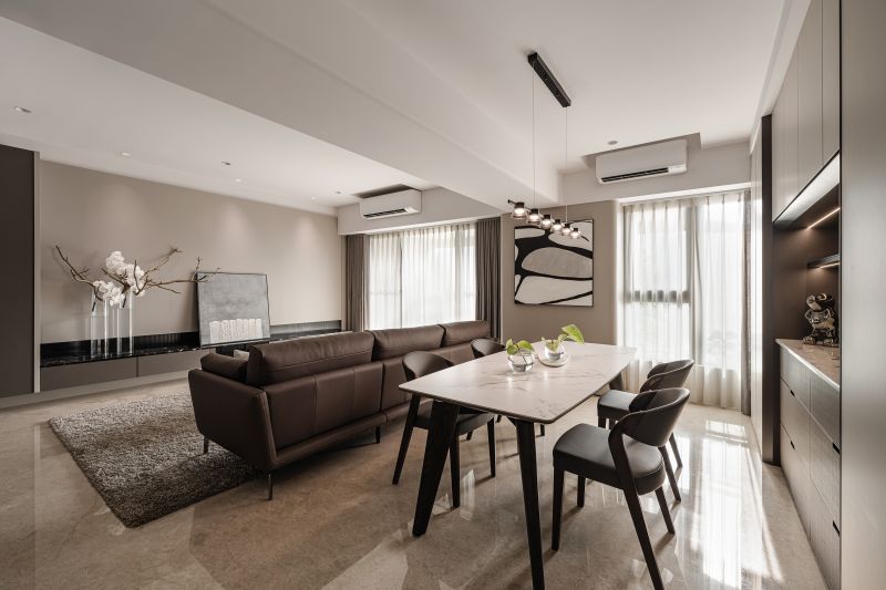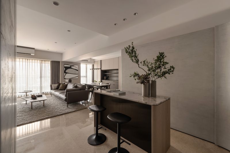 The layout plan integrates utility with aesthetics to create a living space that is both functional and artistically appealing. Durable modular boards are the primary building materials coordinated with easy-cleaned surfaces such as stone and ceramic slabs to relieve the efforts for future maintenance.