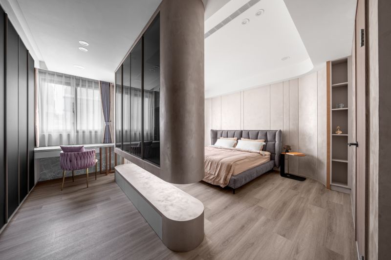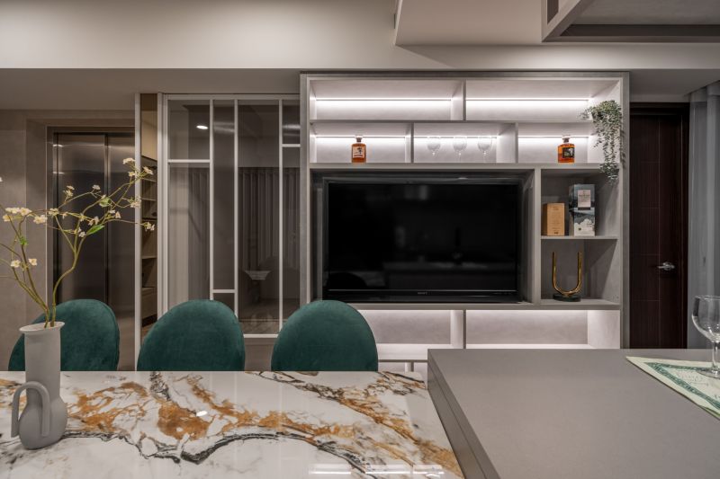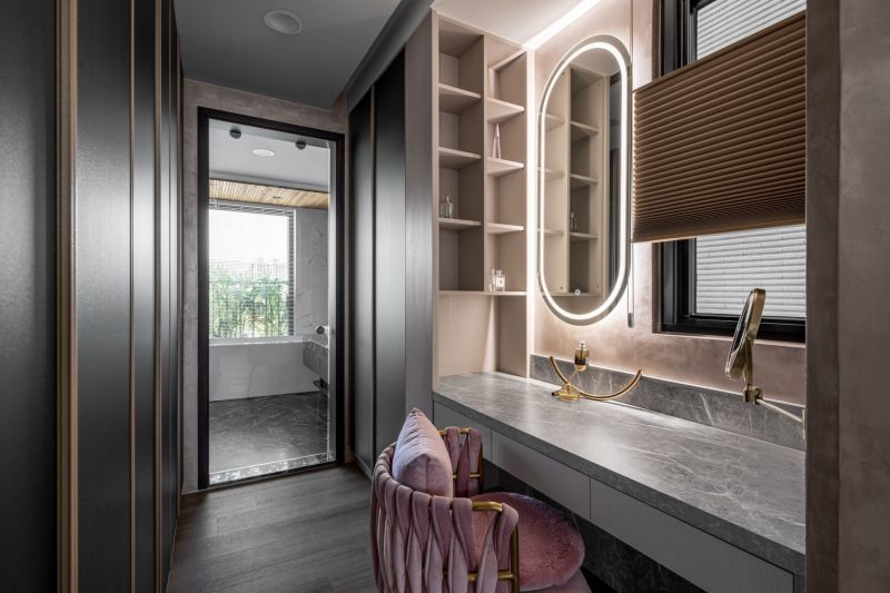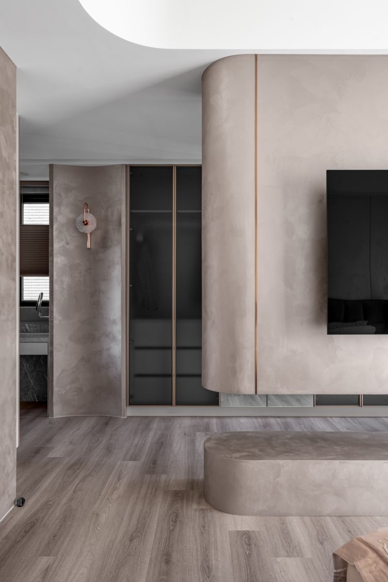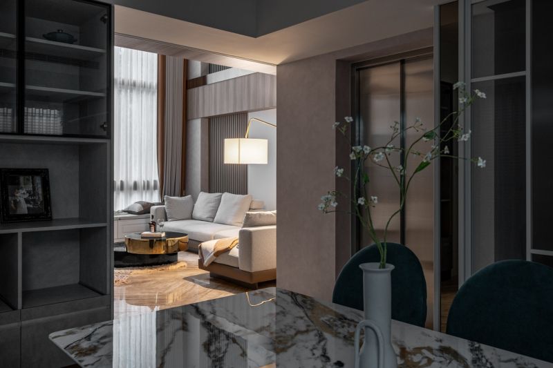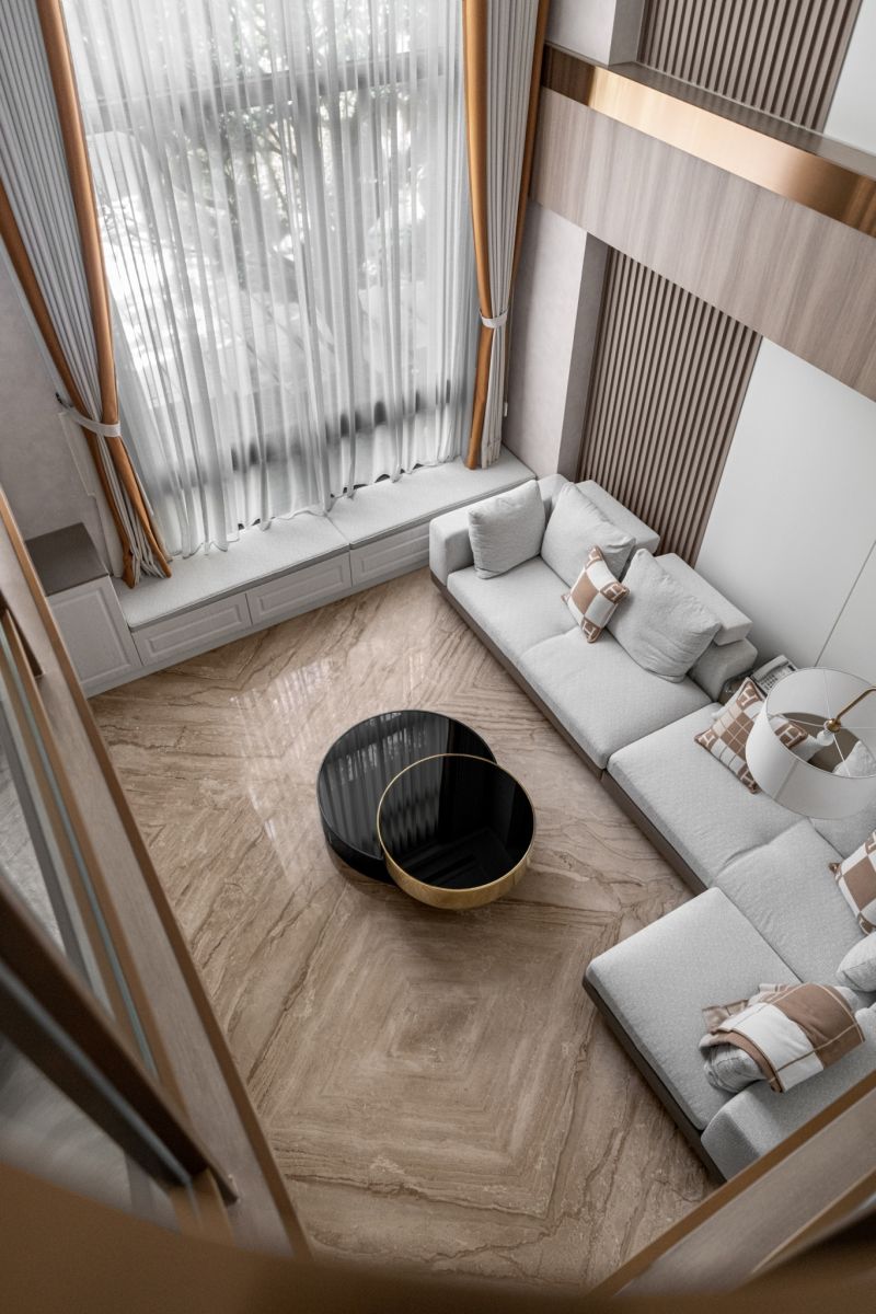 This 6-story villa reimagines vertical living through a glass-and-metal walkway that visually connects levels. The double-height living room anchors the home, featuring marble-patterned floors, metallic trim, and built-in display niches. A soft neutral palette and layered lighting shape a refined yet vibrant atmosphere. Guided by “layered yet not divided,” the design removes barriers to create open, fluid spaces that balance privacy, interaction, and visual rhythm.