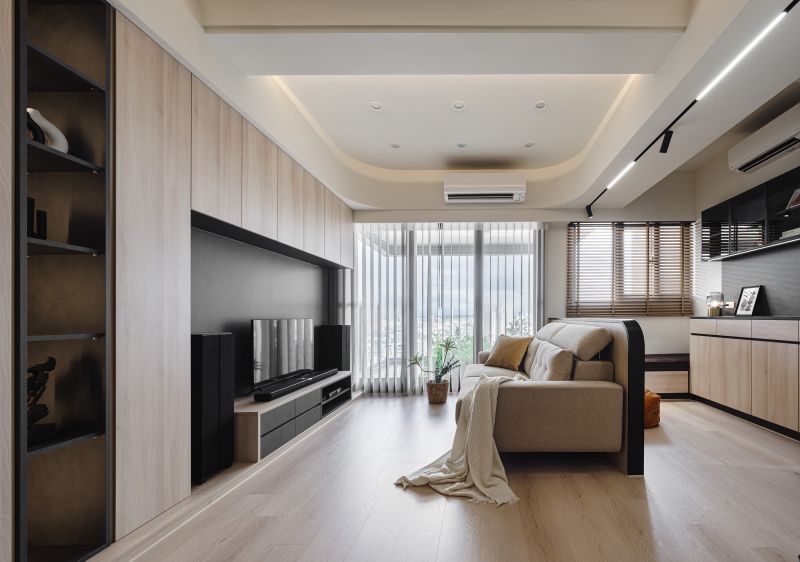 A soothing palette of creamy white and light wood textures renders a warm, elegant tone that complements delicate patterns with modular boards. The black symmetric format outlines a distinctive backdrop and strikes a balance for the entire space.