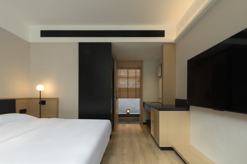 SFEEL Design Hotel (Xi’an Zhonggulou Dachi City Metro Station Branch) presents a refined modern minimalist style infused with Xi’an’s cultural essence. Industrial-inspired materials—micro-cement, dark metal, and natural wood—create a calm yet layered texture. Subtle hues of terracotta red, bronze green, and imperial yellow reinterpret the city’s ancient charm. Through clean geometry and layered lighting, the space achieves balance between light and shadow, form and emotion. The result is an elegant, culturally rooted destination blending modern aesthetics with timeless tranquility.