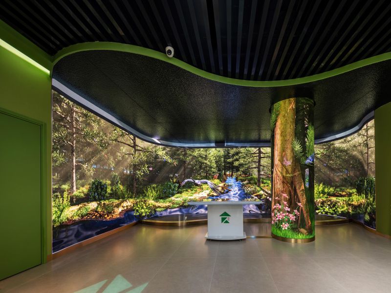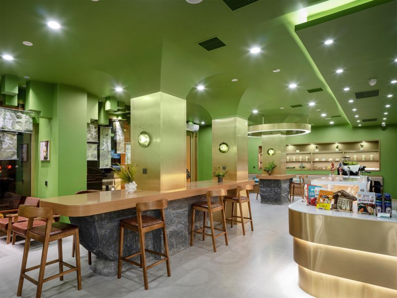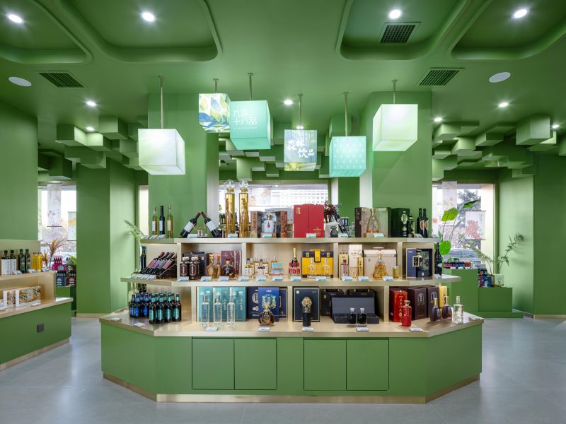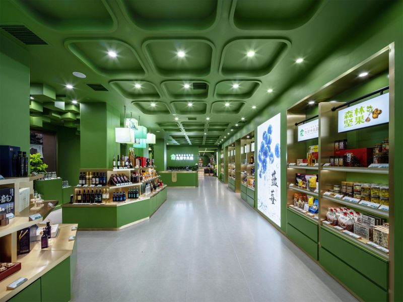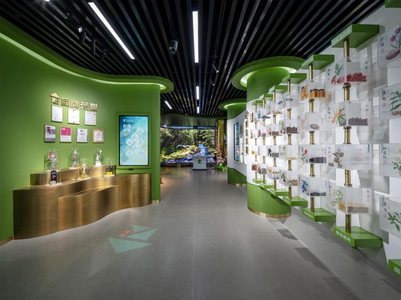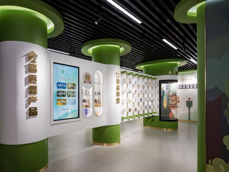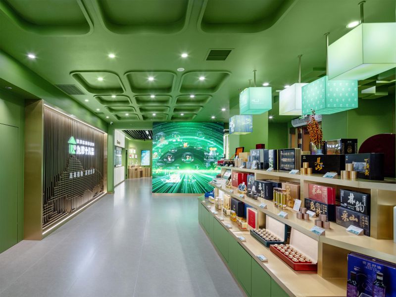 The spatial design of the flagship store for The Nine & Eighteen Natures of China is inspired by “Earth’s Treasures”. The physical store embodies and communicates the ambiance of an immersive alpine forest museum set within a mountainous landscape and a forest corridor. Log colors and a natural green theme for the space aligns with a forest concept, enhancing the natural and health-oriented identity. This "forest corridor" serves as a structured pathway that links product displays, artistic installations, and tasting experiences, fostering a cohesive and evolving experiential space.