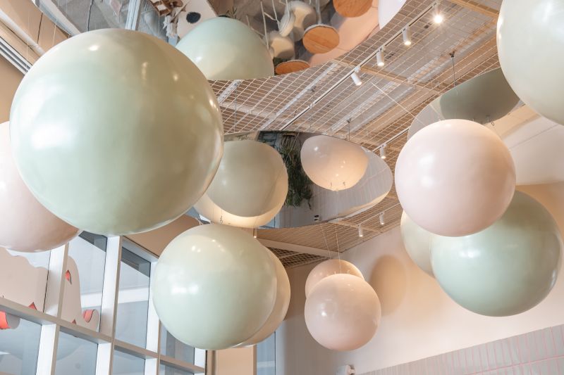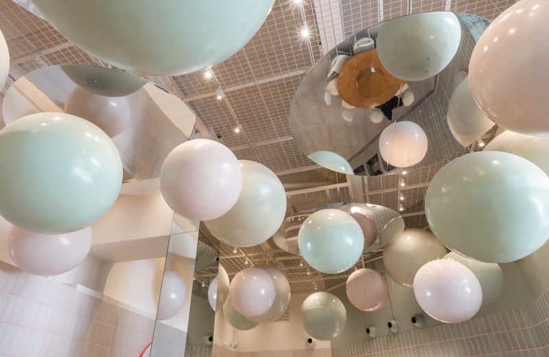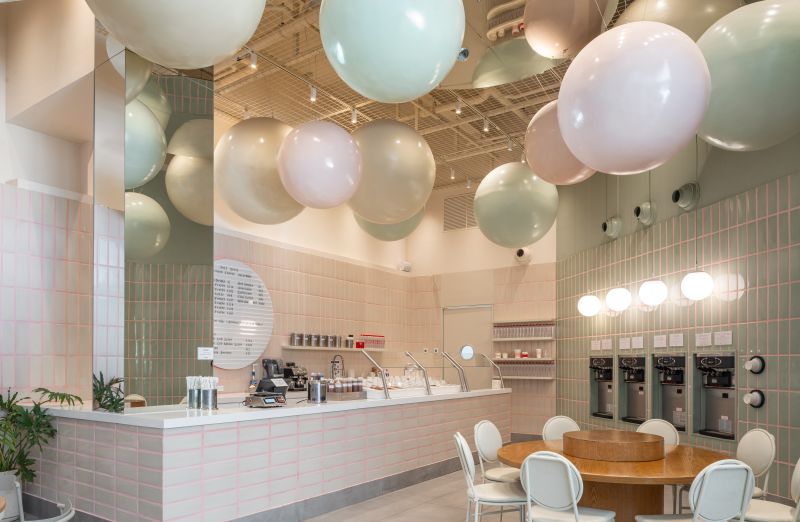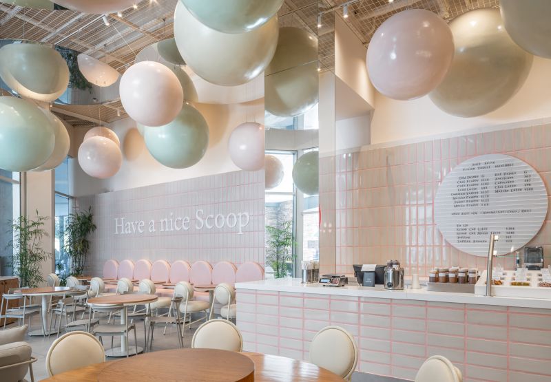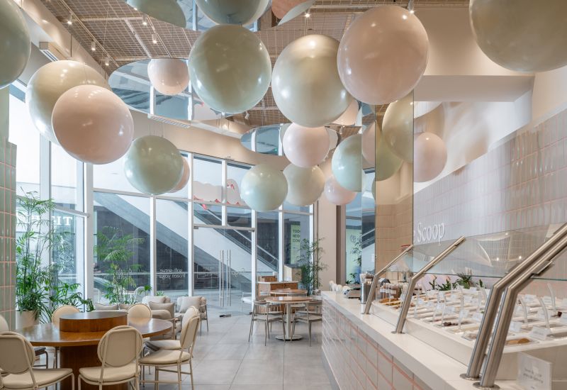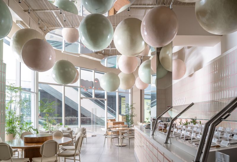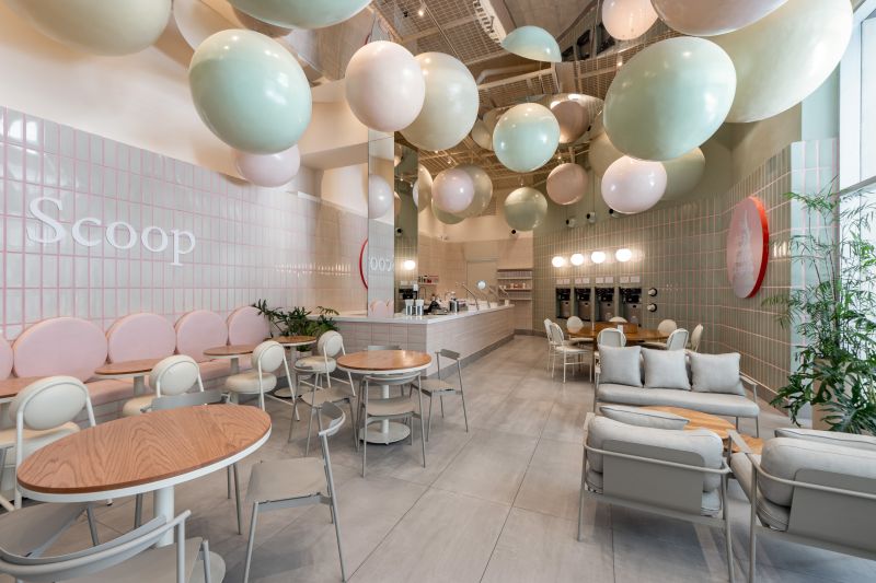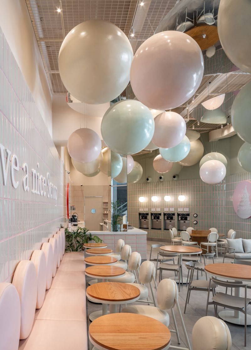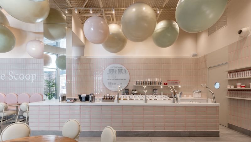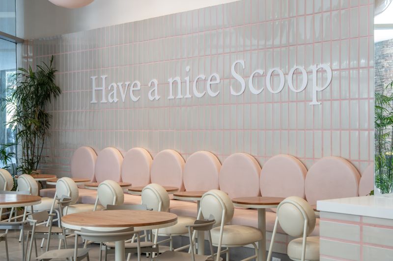 Scoop is a soft-serve ice cream shop where every visit becomes playful and personal. In a 108 m² space at Vía Cordillera, customers serve their own ice cream and choose the toppings that bring it to life. The project revolves around the circle—Scoop’s emblem of infinity, creativity, and joy. Pastel tones and ceramic finishes evoke 1950s nostalgia, while suspended spheres add whimsy and scale. Every element—from cups to furniture—celebrates continuity, community, and endless imagination.