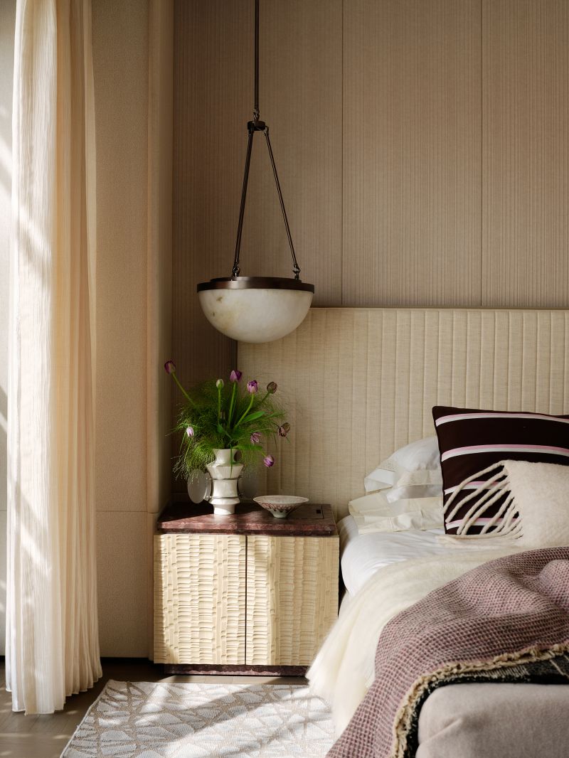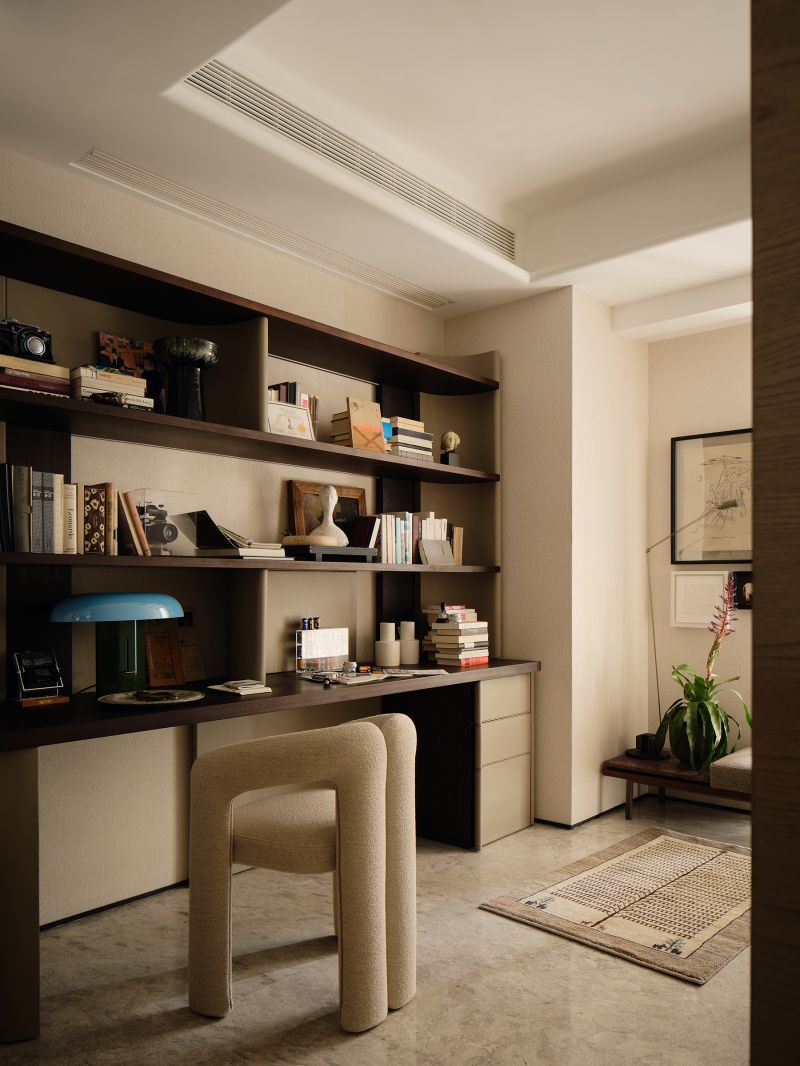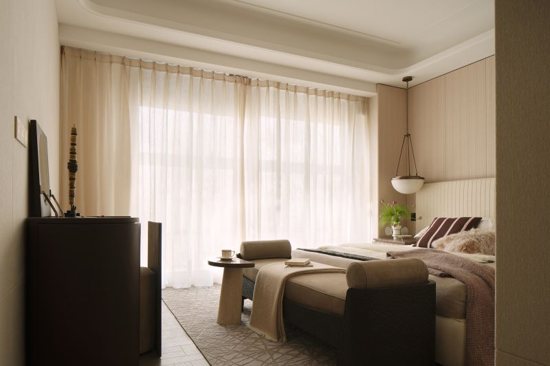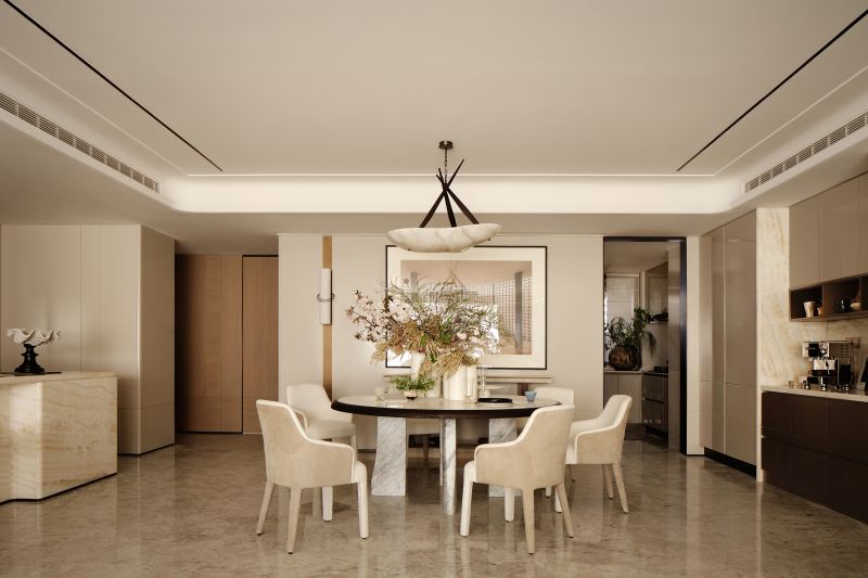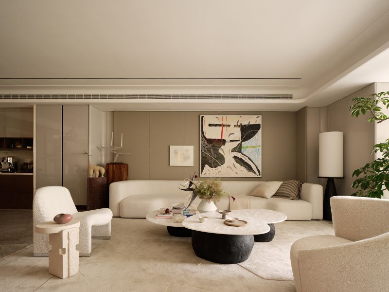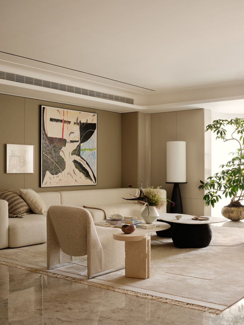 The design emphasizes spatial integrity through unified materials and tones, creating flow between entrances and core living areas. A “weak boundary” approach blurs the separation between the balcony and living room, allowing light and air to move freely. Diverse materials—travertine, linen, marble—enrich texture, while artworks and sculptural elements express calm sophistication. Transitions are subtly defined by material changes, supporting a natural spatial rhythm.