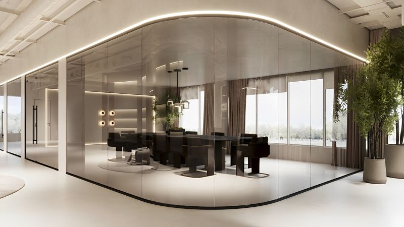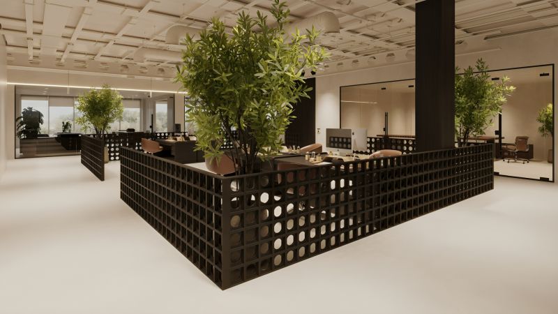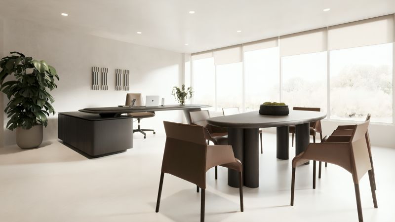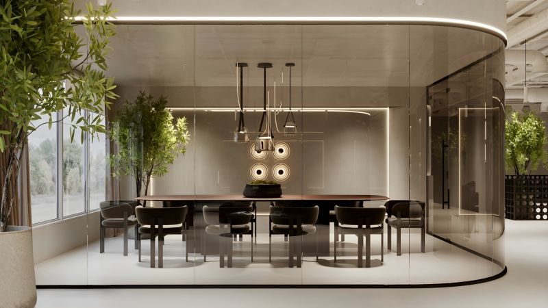 This corporate headquarters is envisioned as a modern sanctuary for innovation, where clean geometry, natural materials, and human-centered design converge. Mother-of-pearl micro cement flooring reflects daylight across rich walnut millwork, textured plaster, and matte metal accents. Integrated lighting and full-height glass partitions enhance depth and transparency, while minimalist furniture softens the architecture. The result is a polished yet welcoming environment that nurtures collaboration and sets a new benchmark for modern corporate design.