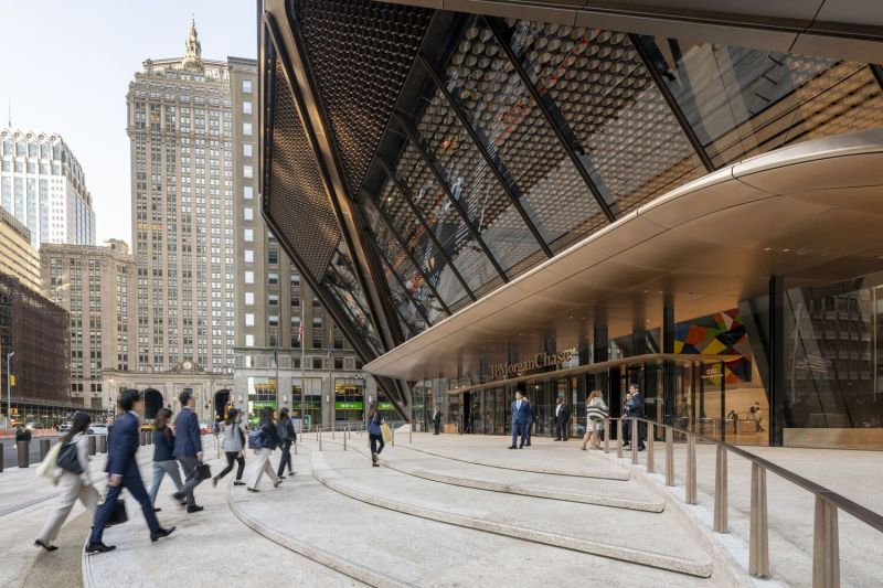 270 Park Avenue offers 2.5 times more outdoor space on the ground level of Park and Madison Avenues than the previous building, featuring wider sidewalks and a large public plaza on Madison Avenue with natural green space and other amenities geared towards the residents, workers, and visitors who frequent the neighborhood. The ground floor lobby serves as the main entrance to the building and includes a monumental staircase and mezzanine level, with ramps and lifts to ensure inclusive access for all.